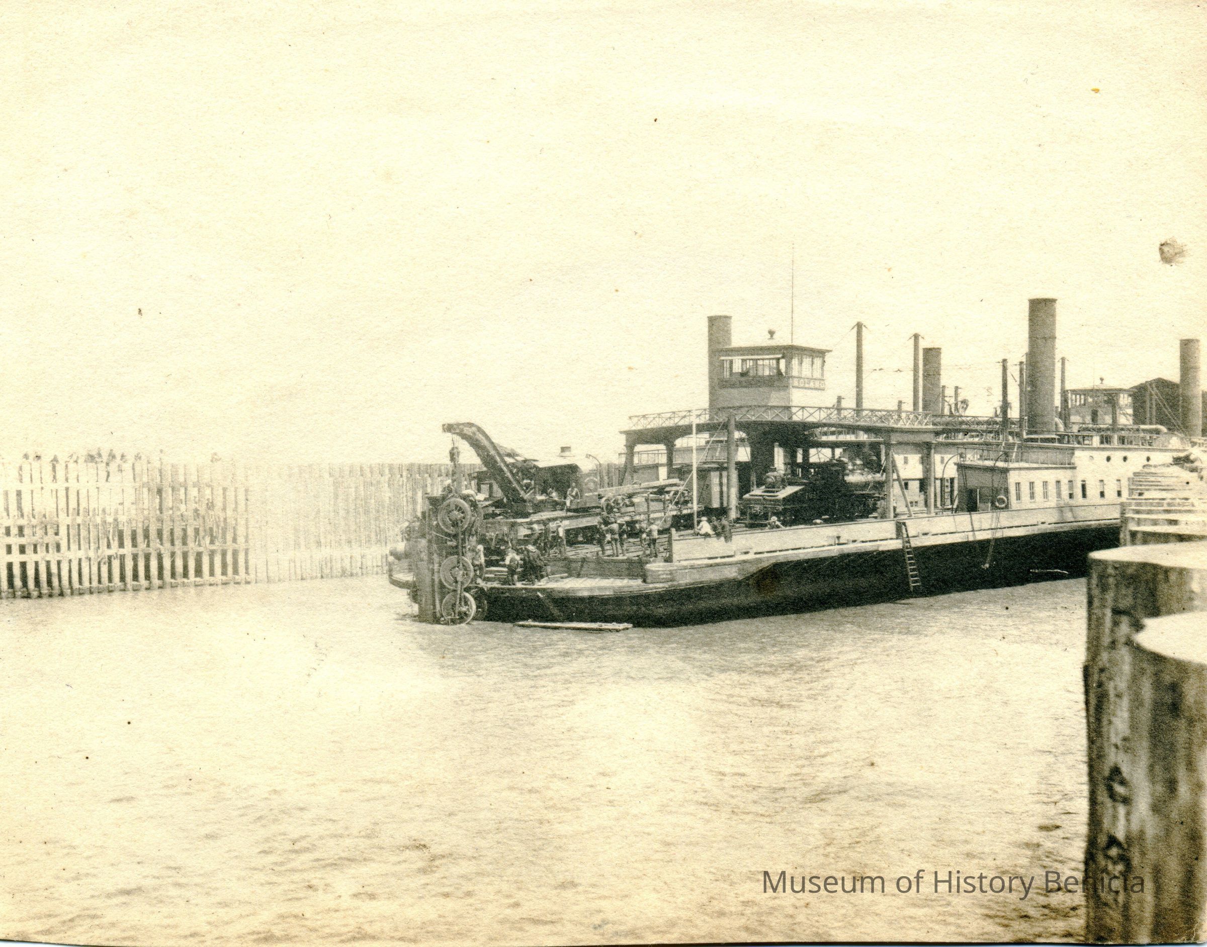 This is a photo of the ferryboat with a train engine being hauled out of the water. There is a crane hoisting the engine out on the back of the ferry.Collection