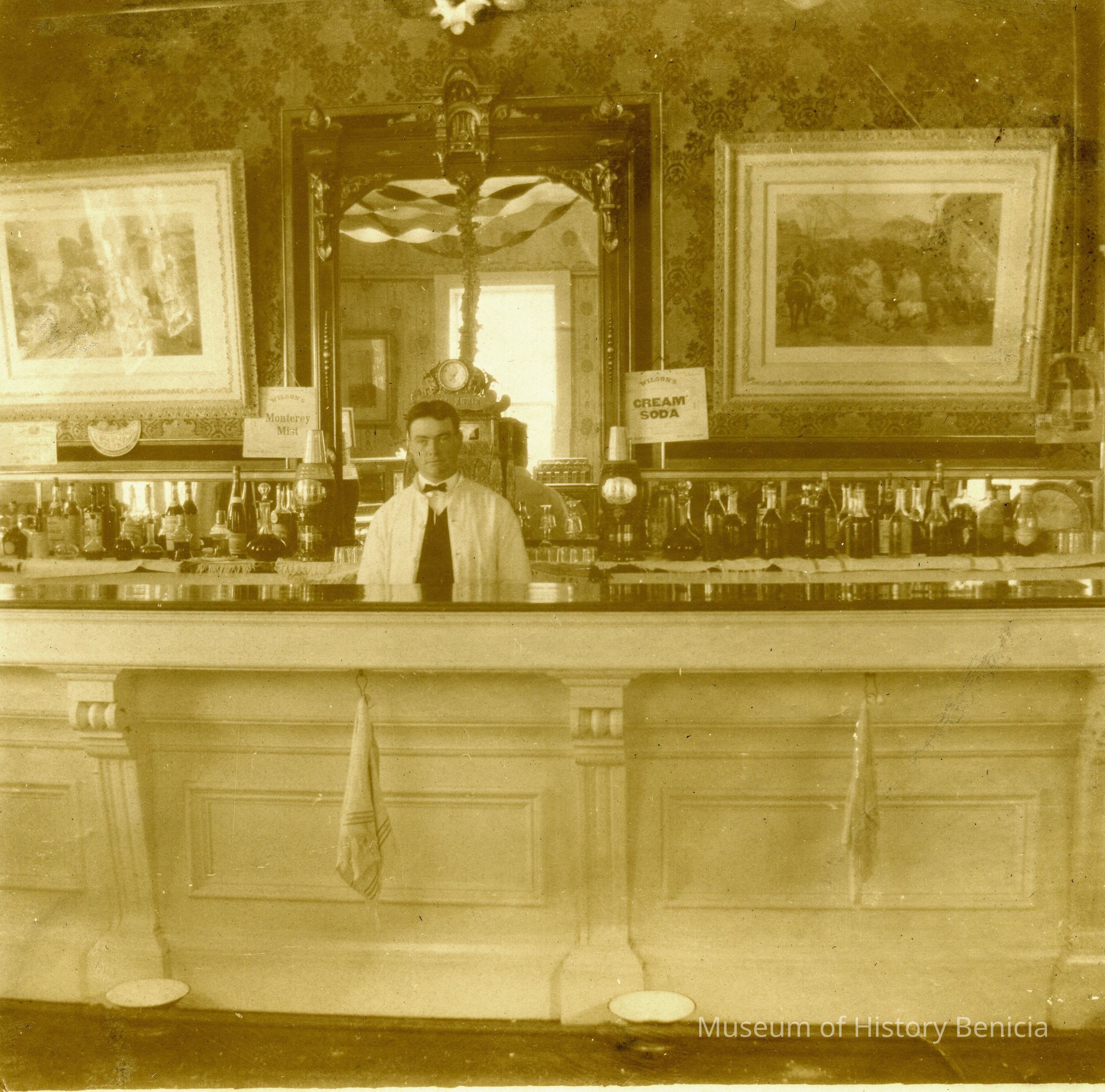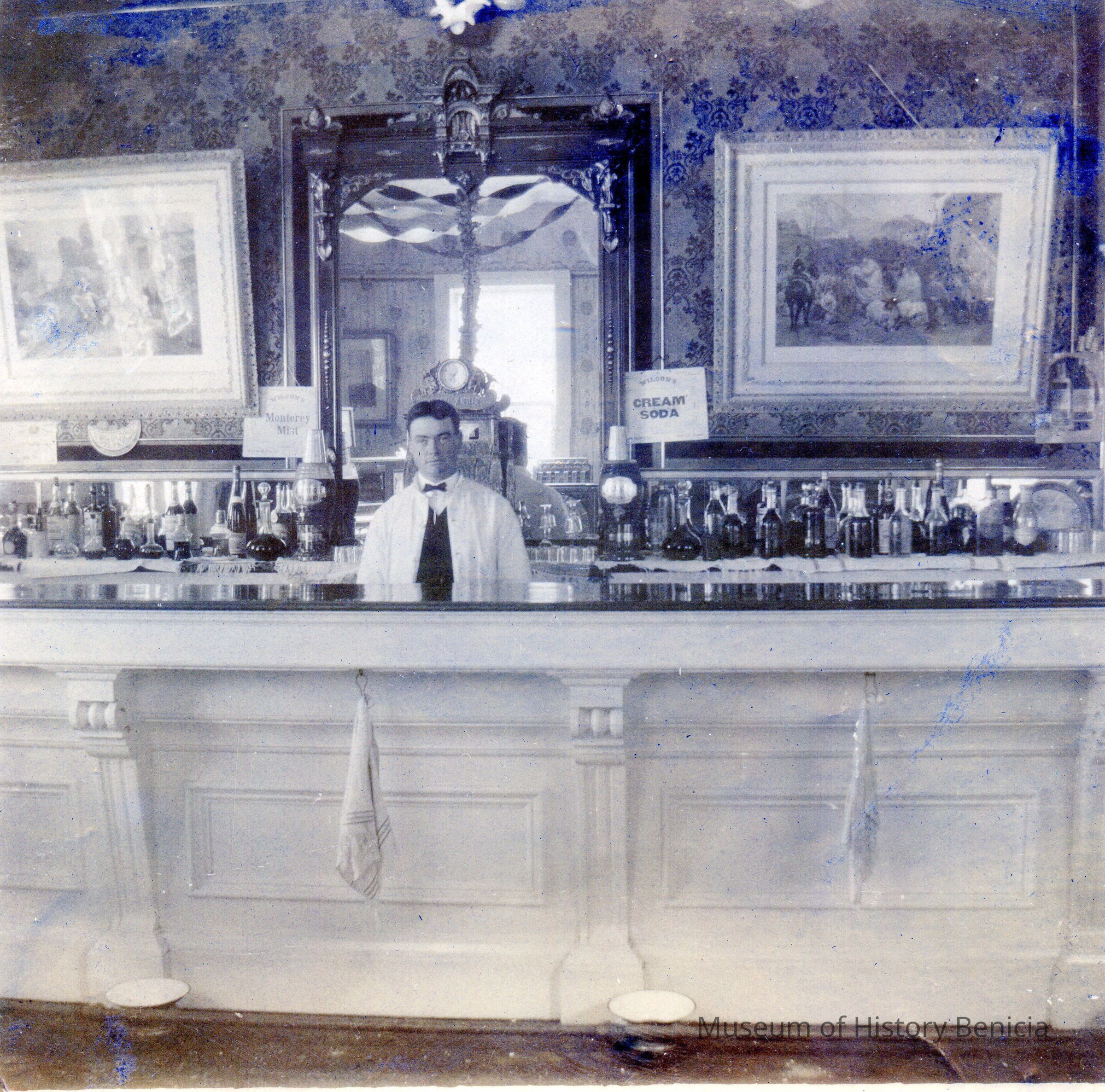 This photo is of the bar at the Palace Hotel (between H and I on First street). It shows an unknown bartender behind an ornate bar with two framed paintings behind the bar. There is a sign for Wilson's Cream Soda and another for Wilson's Monterey Mist behind the bar. No date on the photo but before the fire in 1932..Collection
