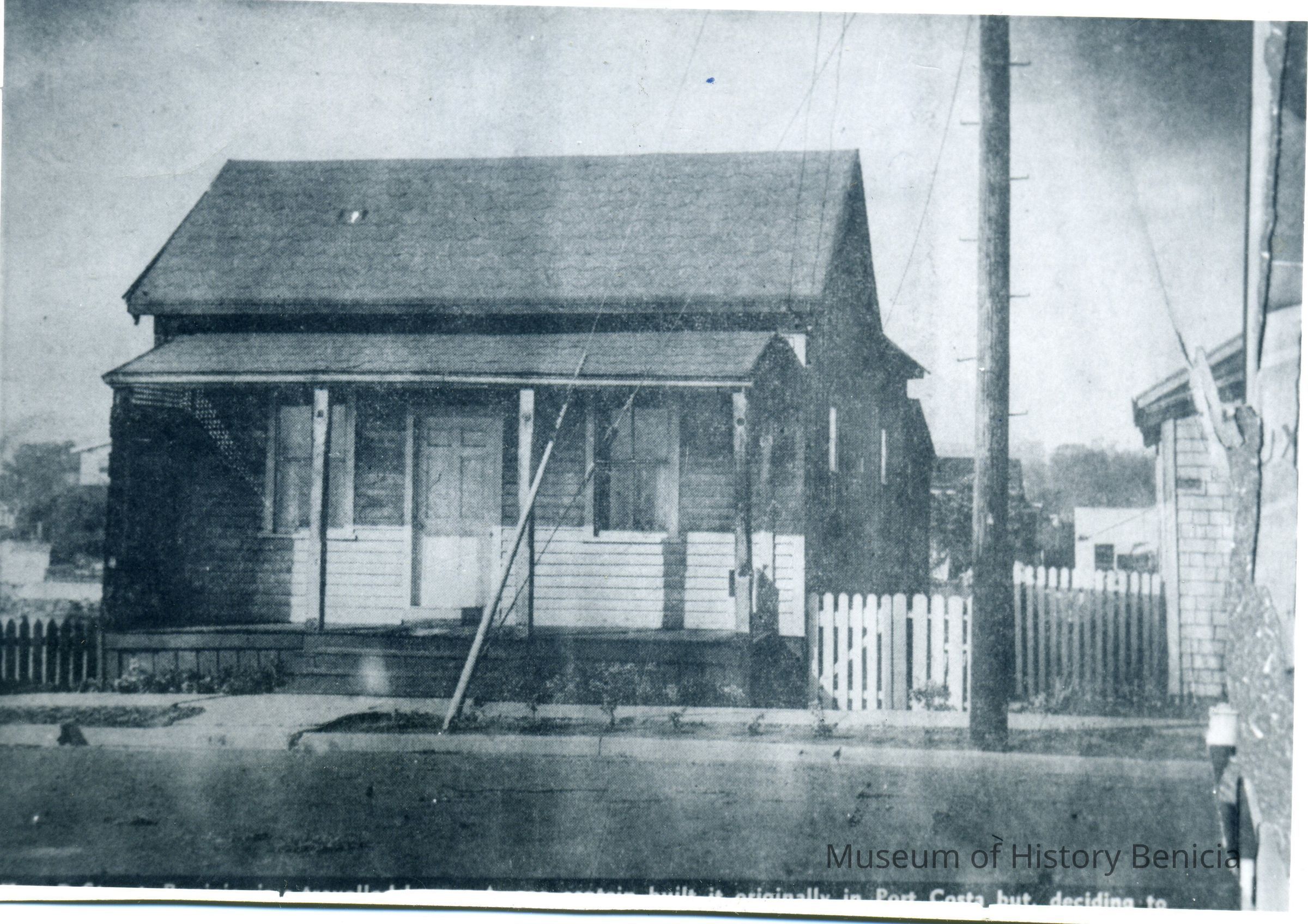 This photo is a copy of a photo from a book or magazine. It shows a small house and part of the description that was printed below the photo. All I can read is "... built originally in Port Costa but deciding to ...".Collection