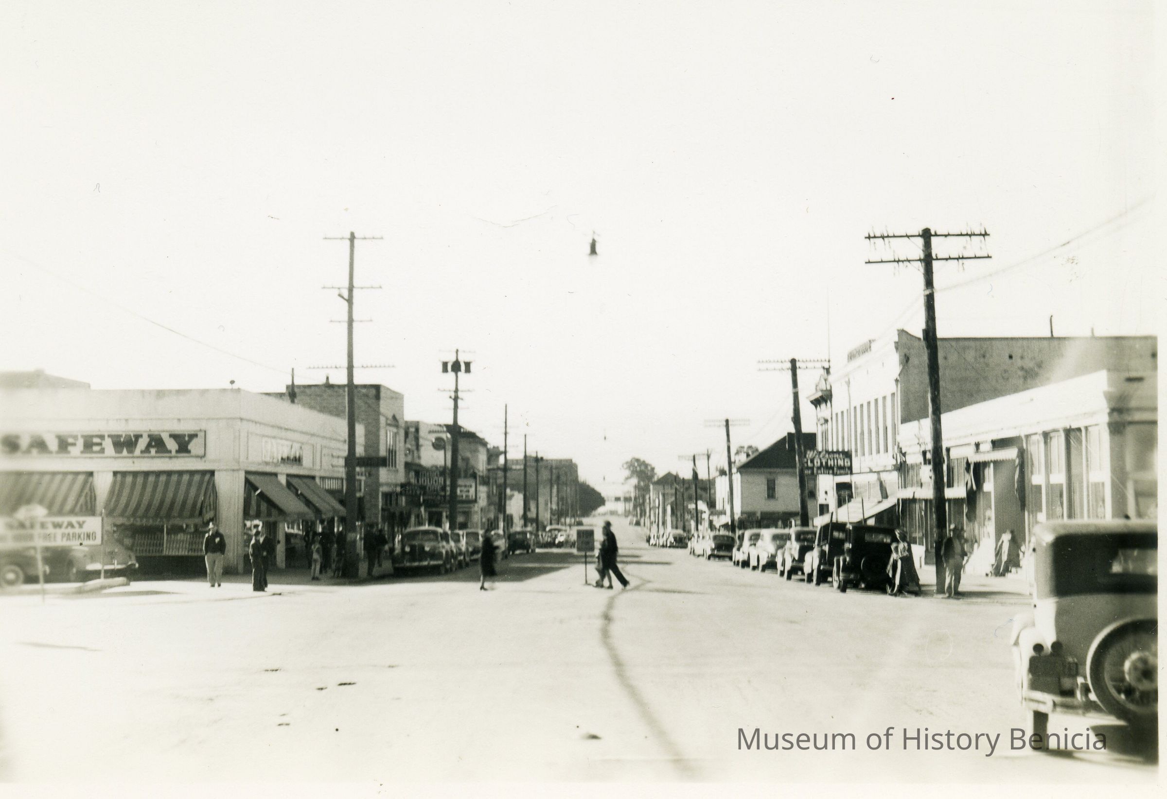 This photo is of First Street in Benicia around 1930. It shows the Safeway store, Royal Bakery, Main Liquor Store, Manuel's Place, and the State Theater on the left and Wilson's clothing store and ODD Fellows building on the right.Collection
