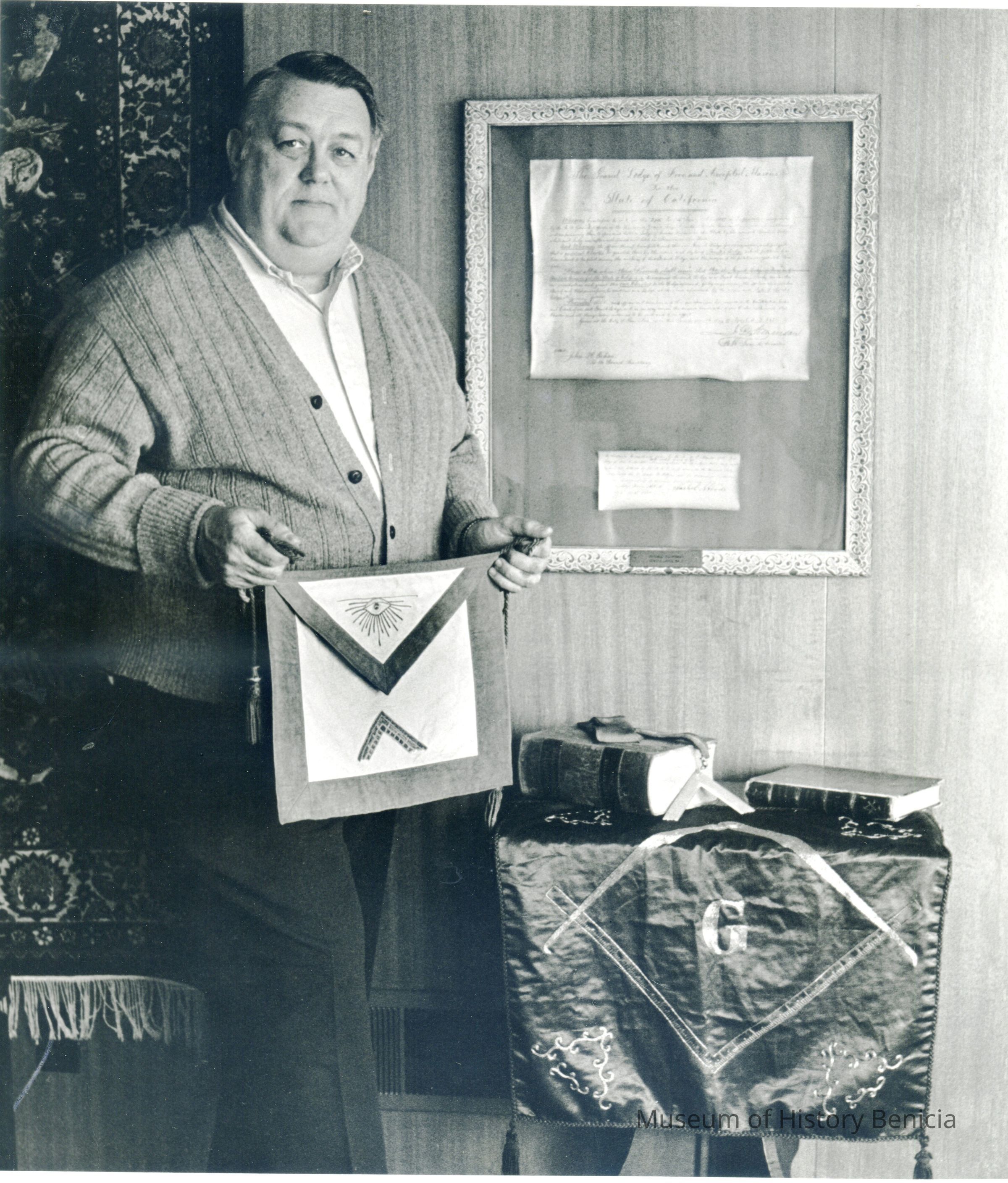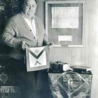 This is a photograph of .Gerry Patten with Masonic items.
