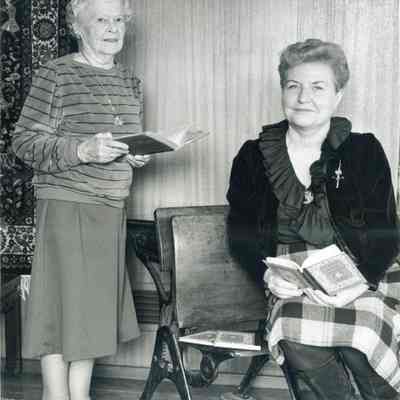 This is a photograph of Ruth Alexander and Mrs. Carolyn Quandt looking at historical books.