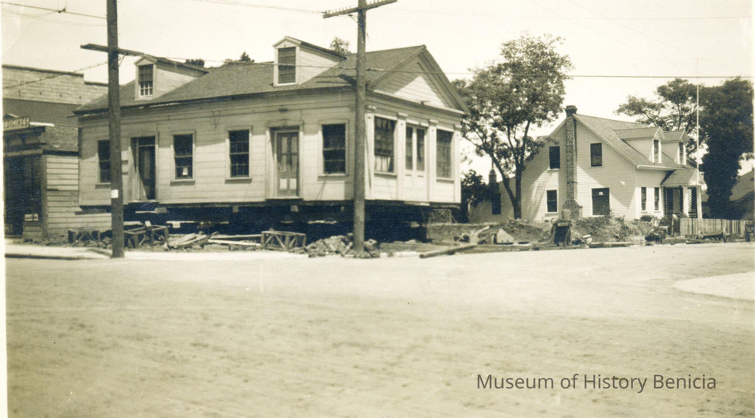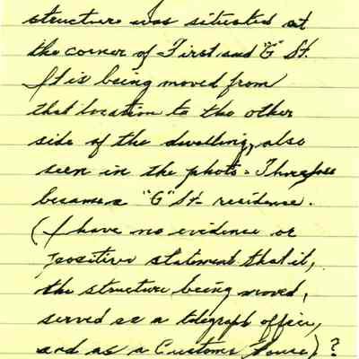 This is a photograph of a house being moved. Harry Wassmann has a note with the photo saying that the house is at First and "G" street and is being moved to "the other side of the dwelling, also seen in the photo". Harry raises the possibility that this may have been a Custom's house and/or telegraph office but he says he has no proof. Harry says that people by the name of Perry lived in this house during Harry's life. The house being moved was finally demolished and James Lemos built his house on the lot.Collection