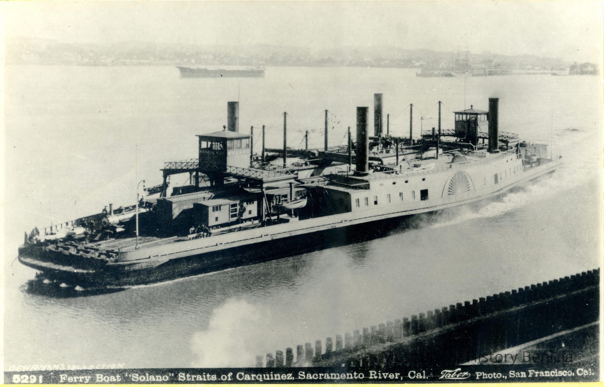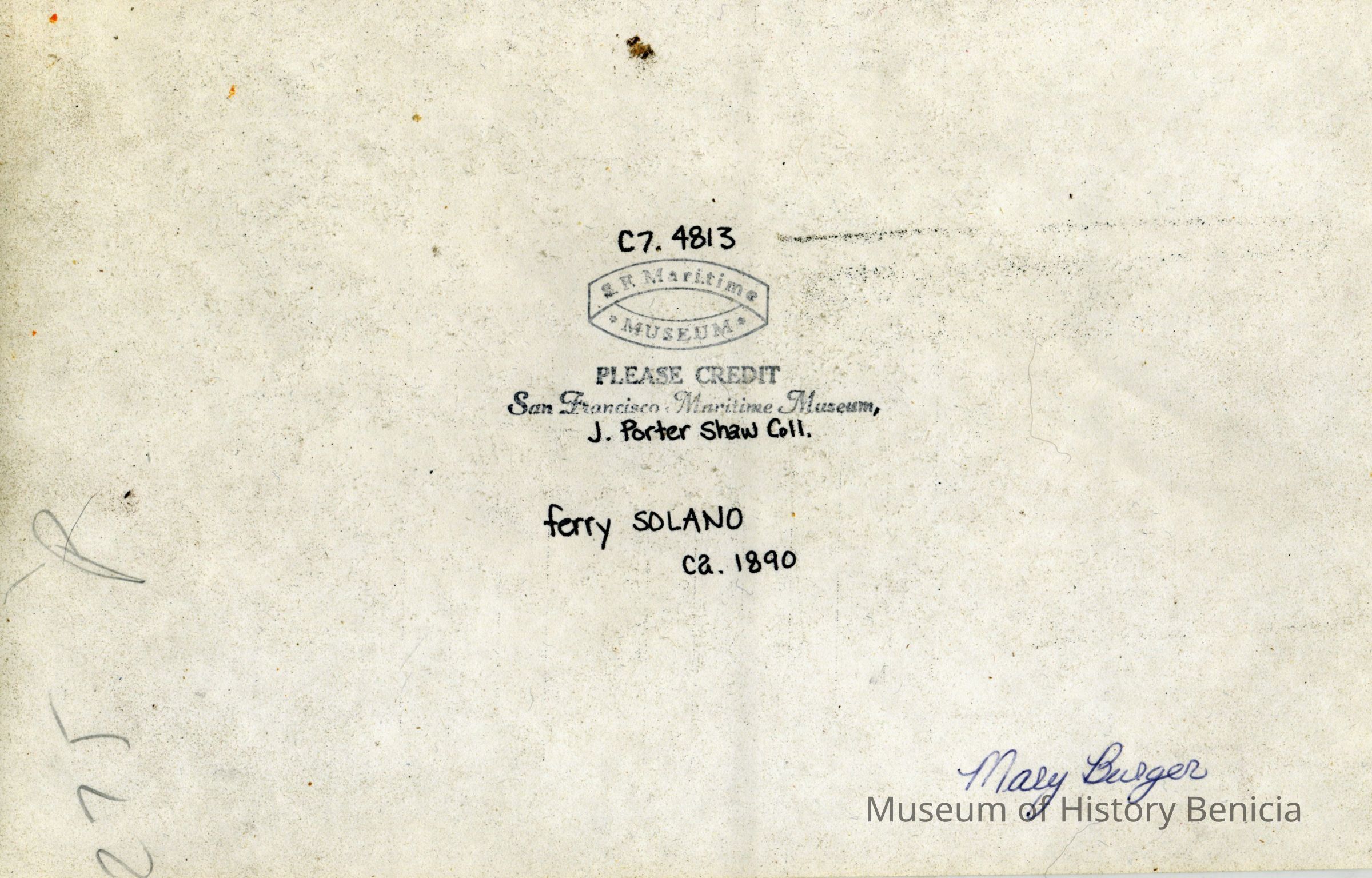 This is a photo of the ferry boat "Solano" on the Carquinez Strait. The photo was taken or published by the Taber Photo Co. The back says the photo came from the S.F. Marttime Museum and should be credited to J. Porter Shaw Coll.