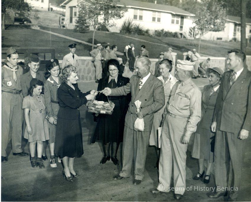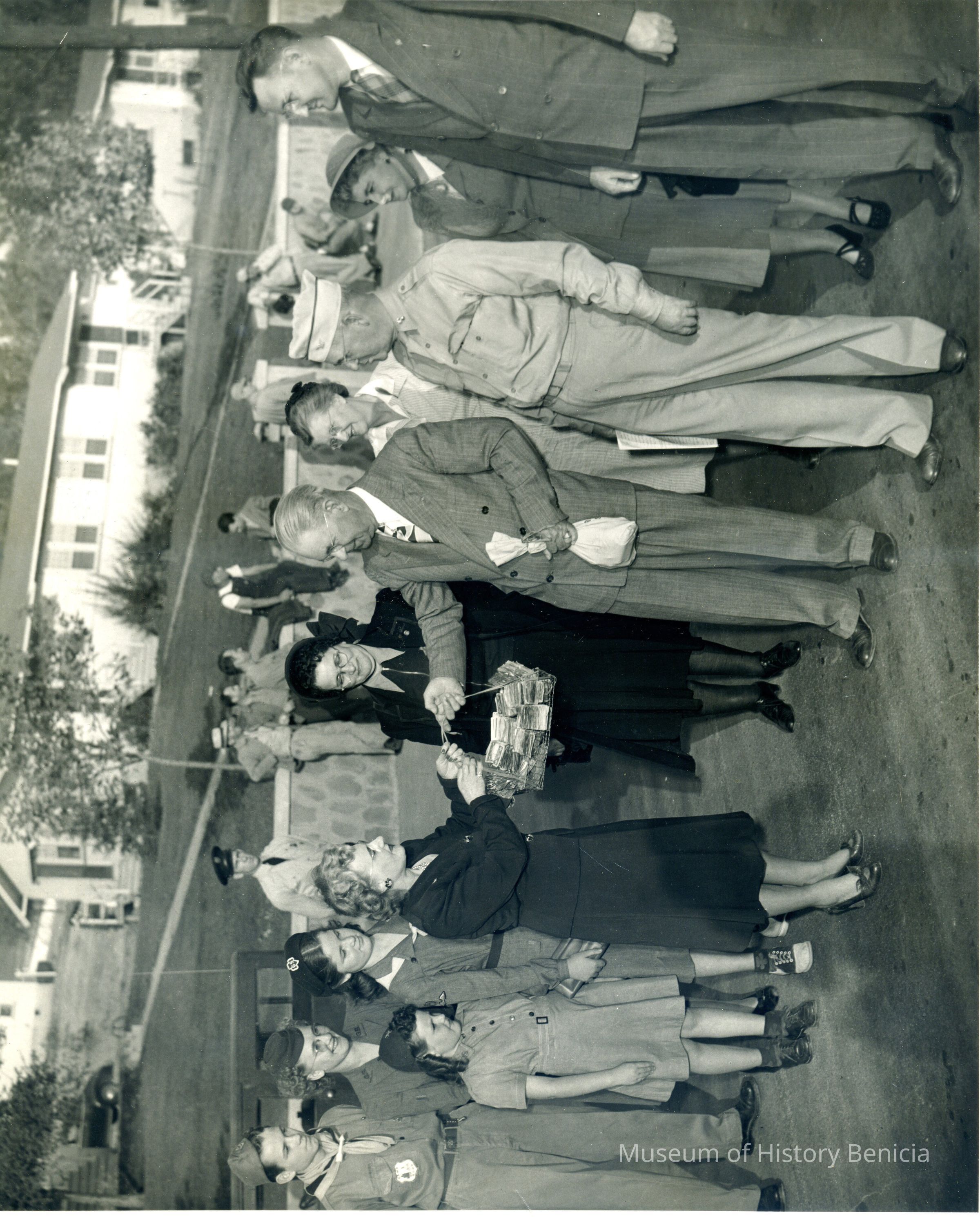 This is a photograph of an award presentation at the arsenal. Girl Scouts and Boy Scouts are on the left and several men and women are standing on the right. A basket cash and a bag of money is being transferred. Written on the back is "recognized at this time , only Mike Fitzgerald, one-time Benicia mayor located at the right hand edge of photo.Collection