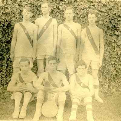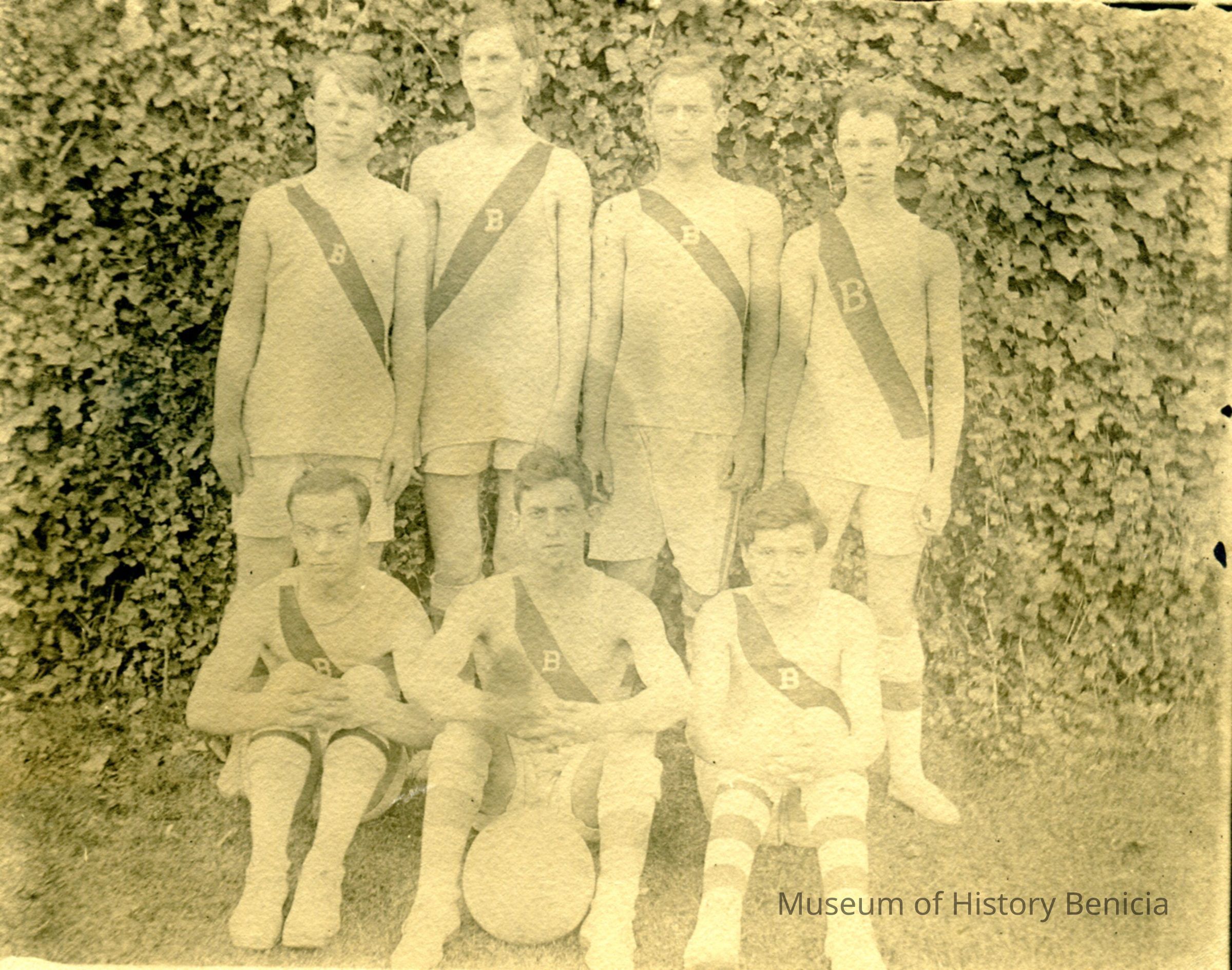 This is a photograph of the Benicia basketball team. From the look of the uniforms and the simple sash with just a "B" on it I would guess from about 1915 to 1920. None of the players are identified.Collection