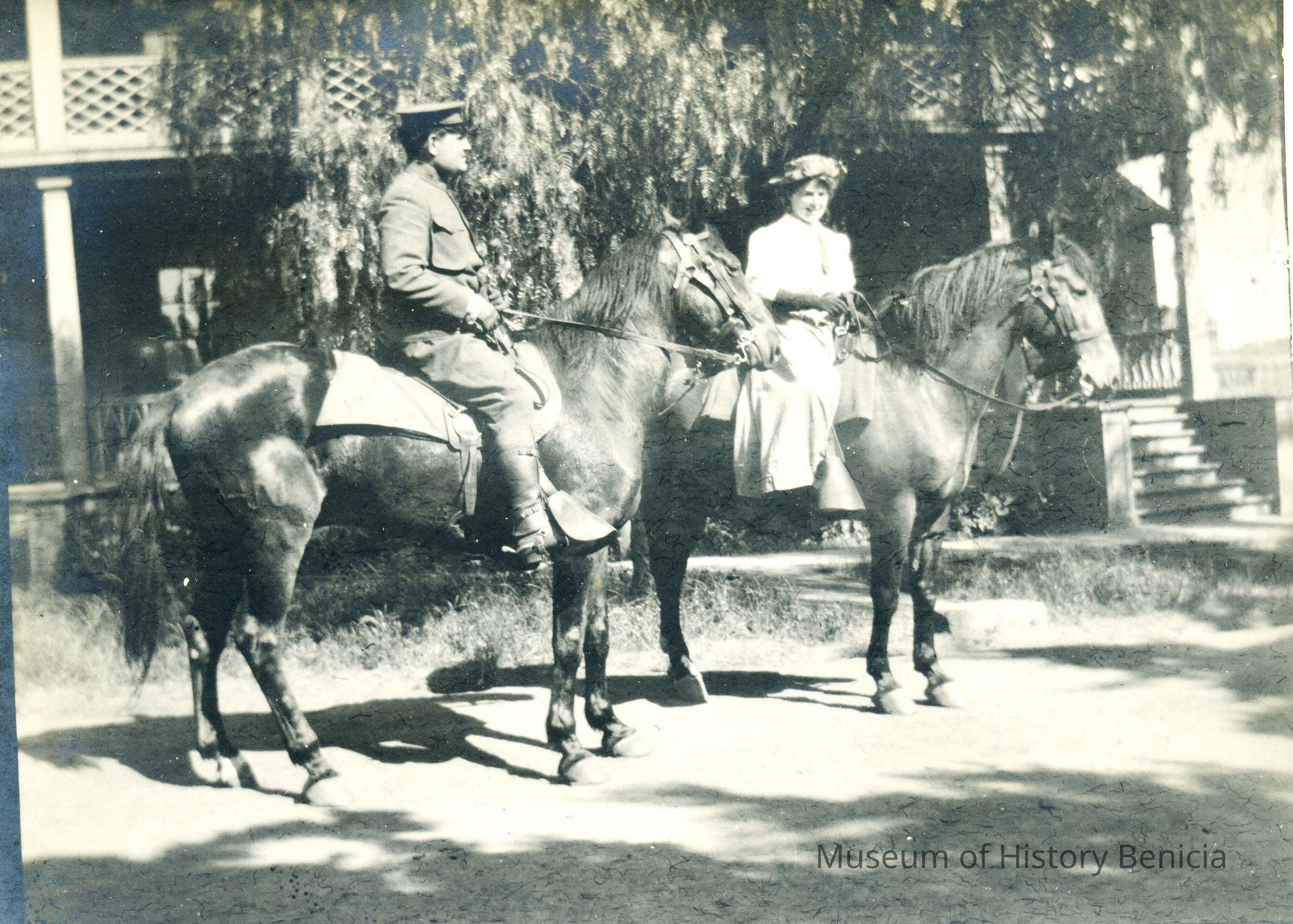 This is a photograph of a woman and a soldier at the Benicia Barracks on horses. The clothes and uniforms look to be about 1915. The number "4." is written on the back.Collection