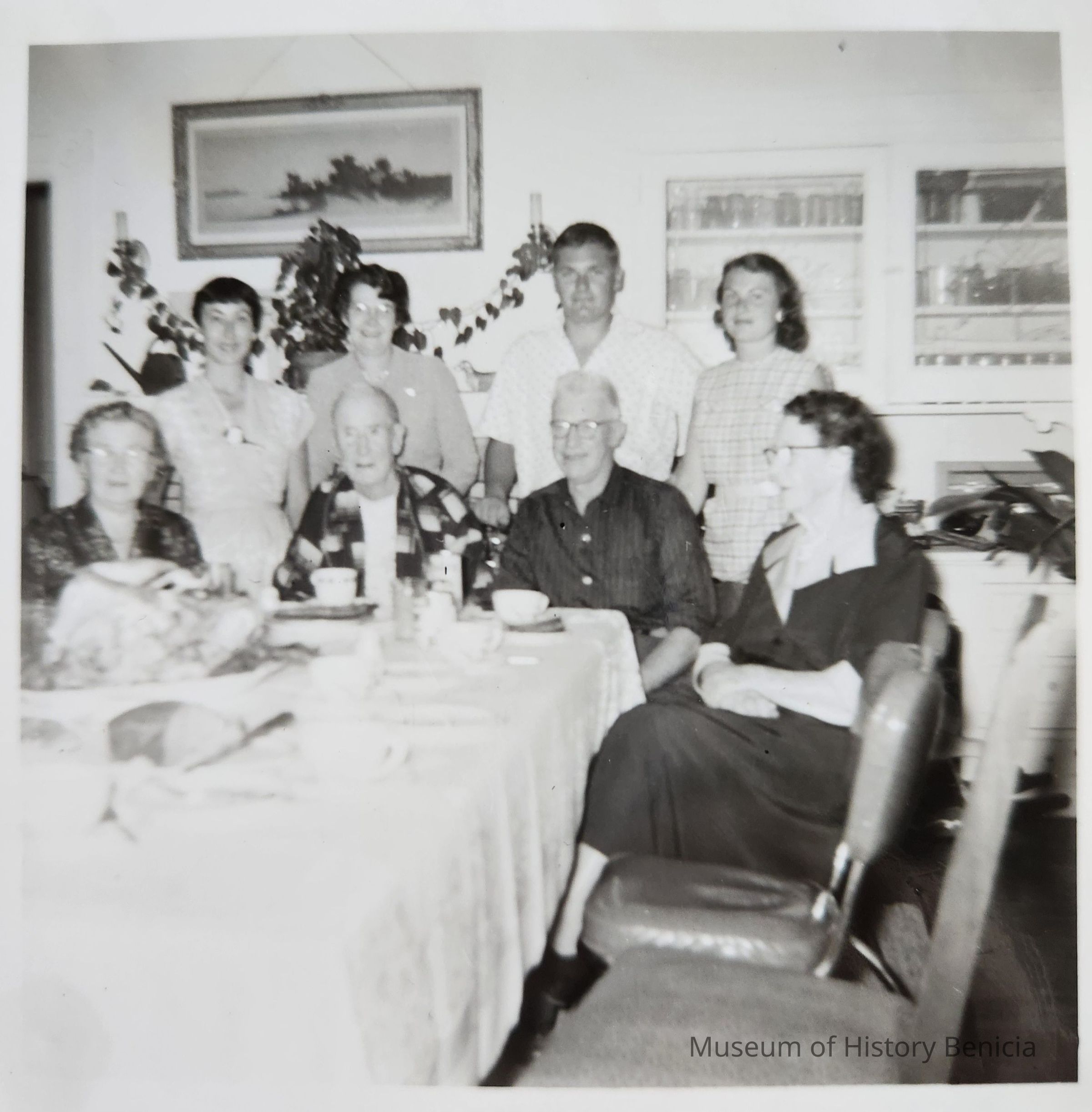 B/W Photograph of eight unidentified people sitting and standing by a dinner table