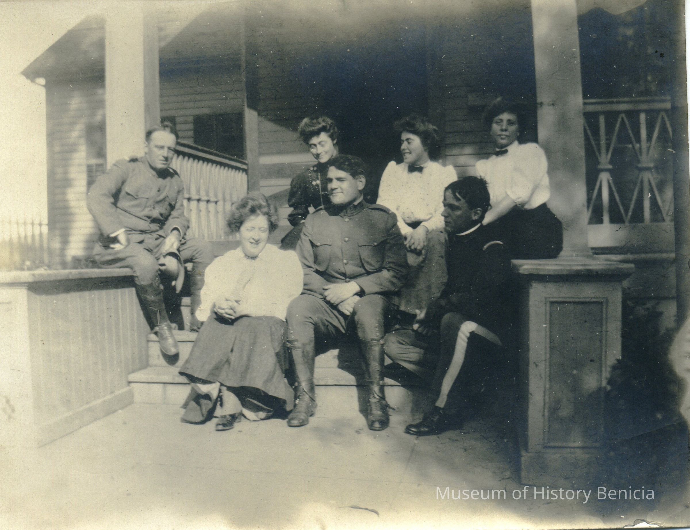 This is a photograph of ladies and soldiers at the Benicia Barracks. They are gathered on the steps. The clothes and uniforms look to be about 1915. The number "6." is written on the back.Collection