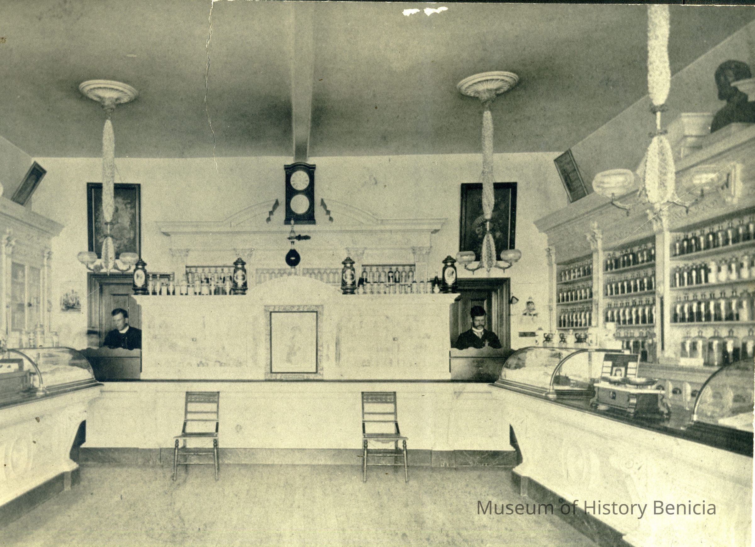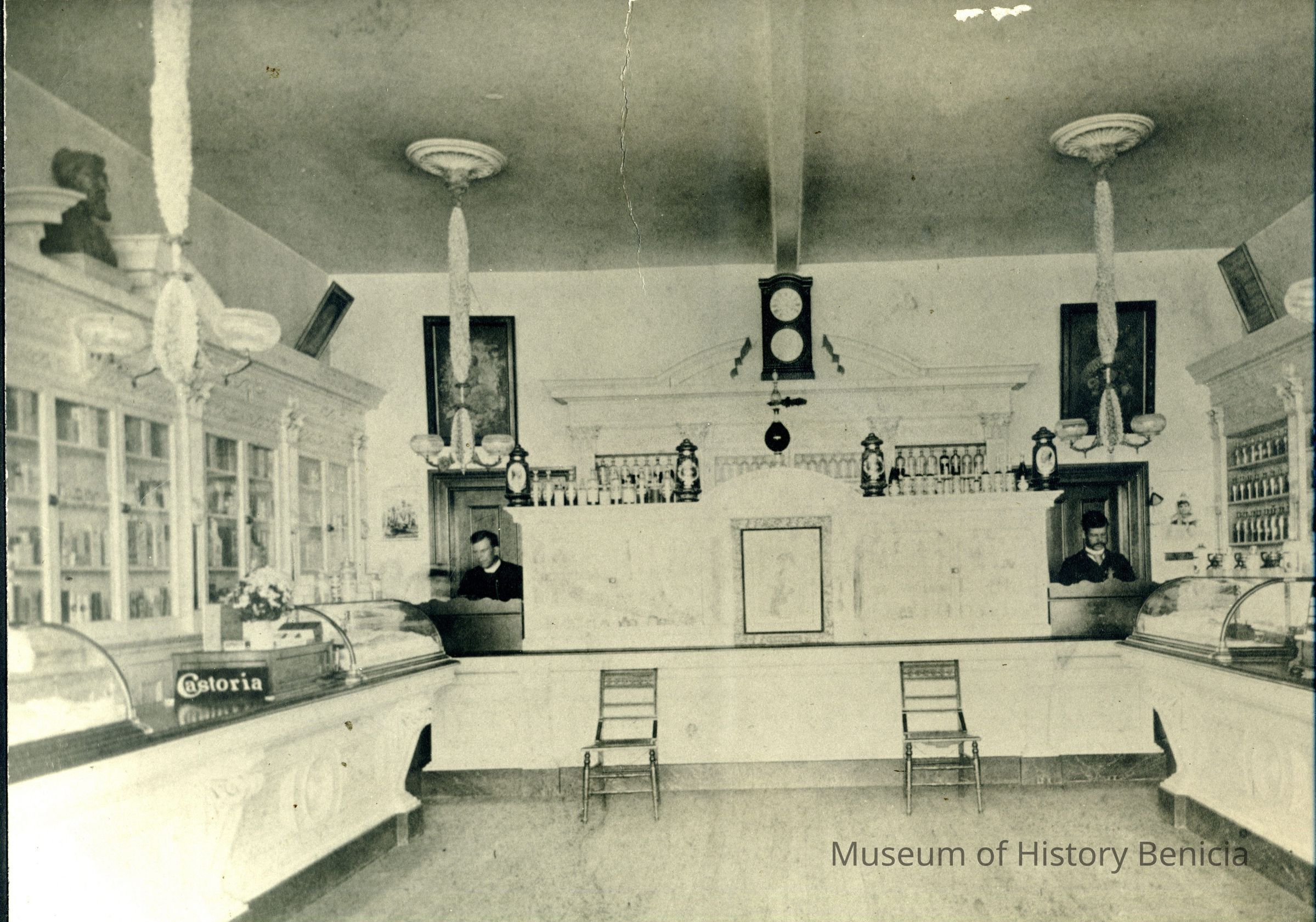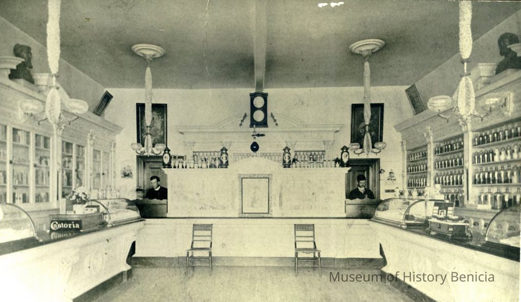 This is a photo of the Sanborn and Co. City Pharmacy. It was at the N.W. corner of "H" and First streets in Benicia.
