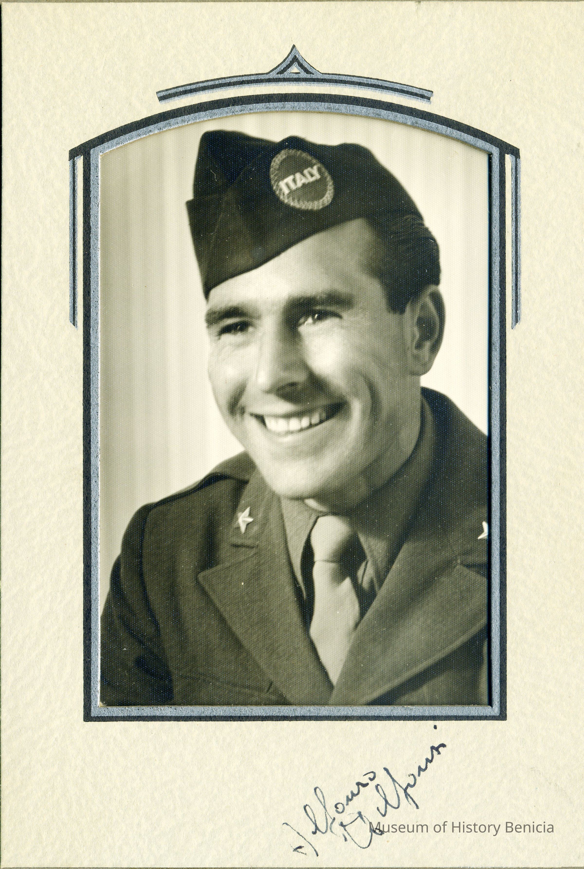 A photo in an envelope of a military man in uniform. He has a "Italy" patch on his cap. The photo is signed Alfonso Dilforin.