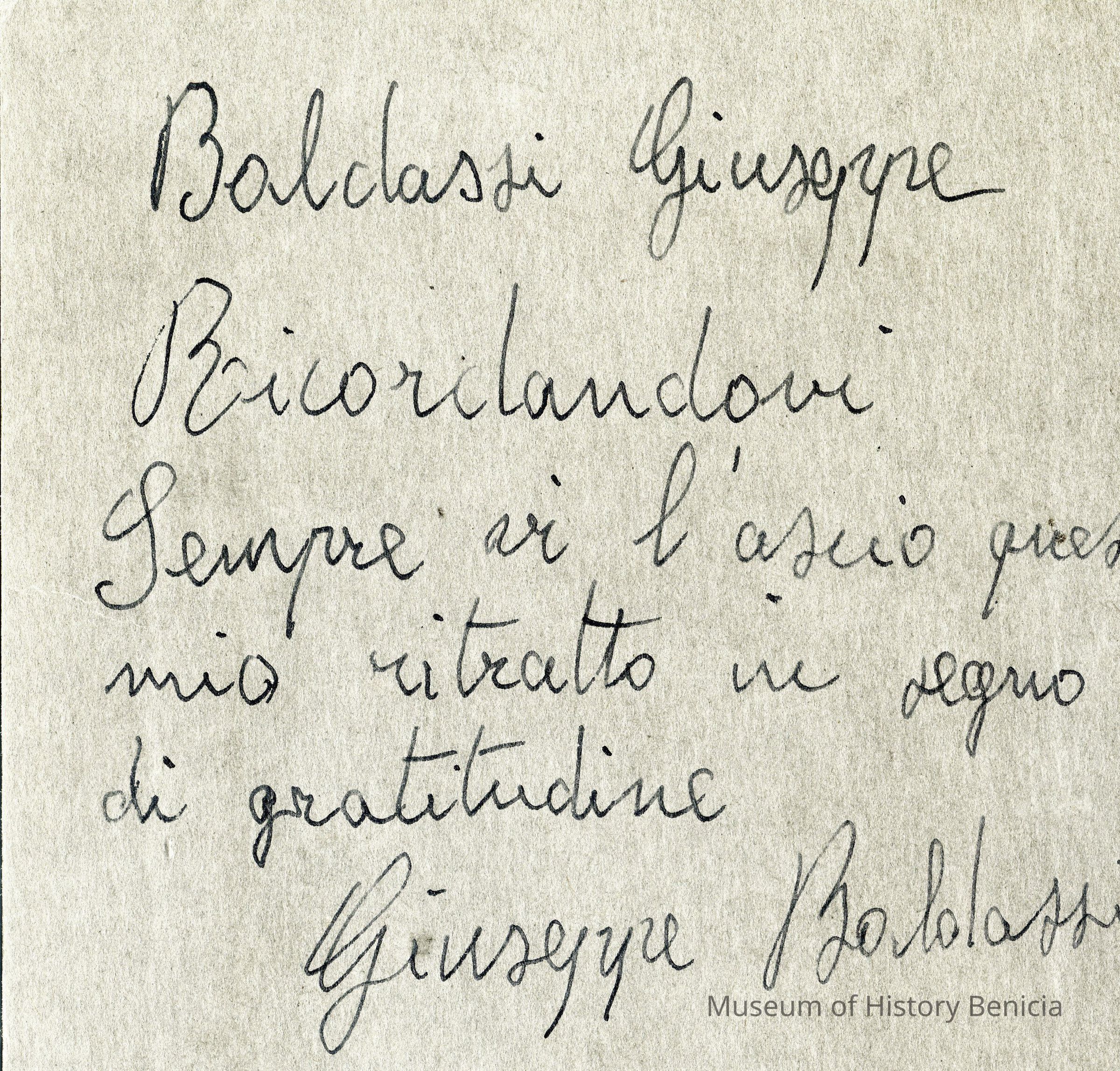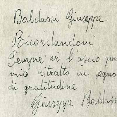A photo in an envelope of a military man in uniform. The photo is signed Giuseppe Baldassi and has an inscription written in Itailian inside the photo envelope.Collection