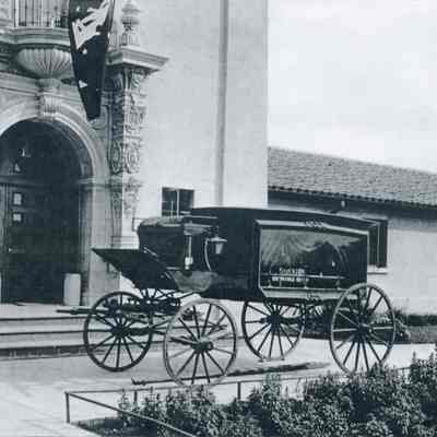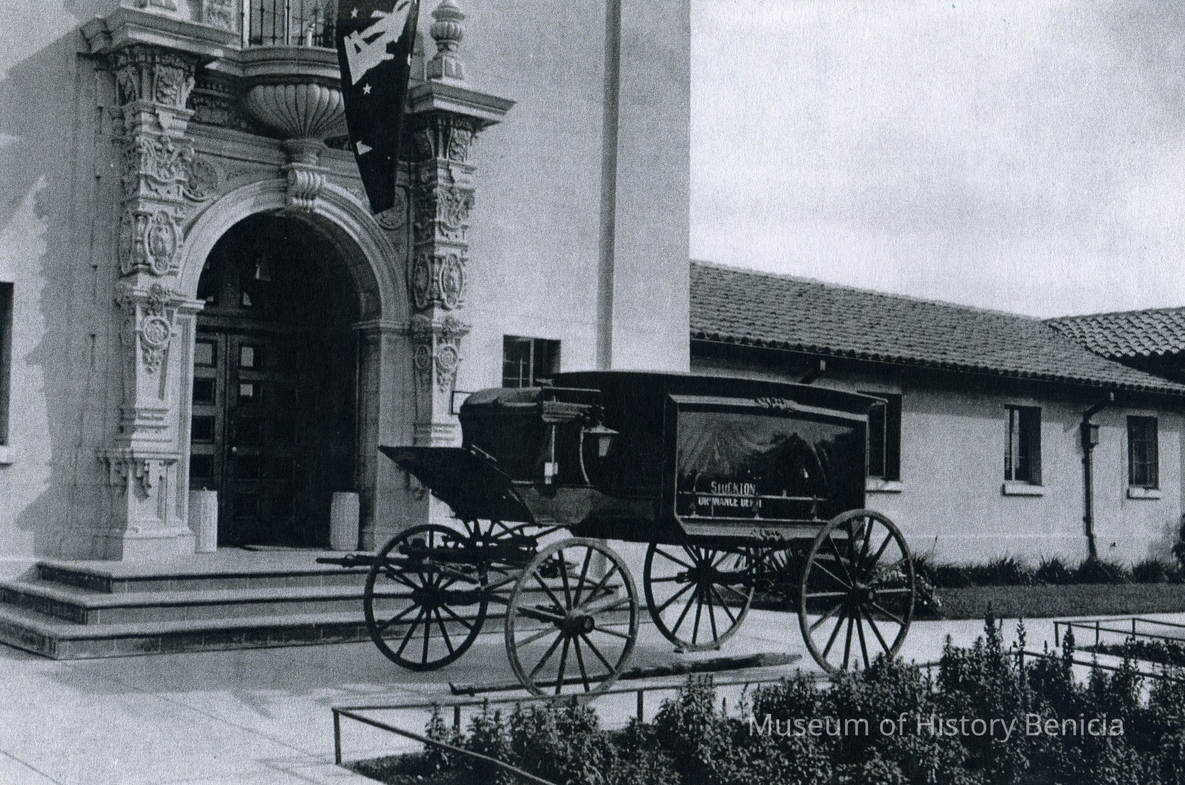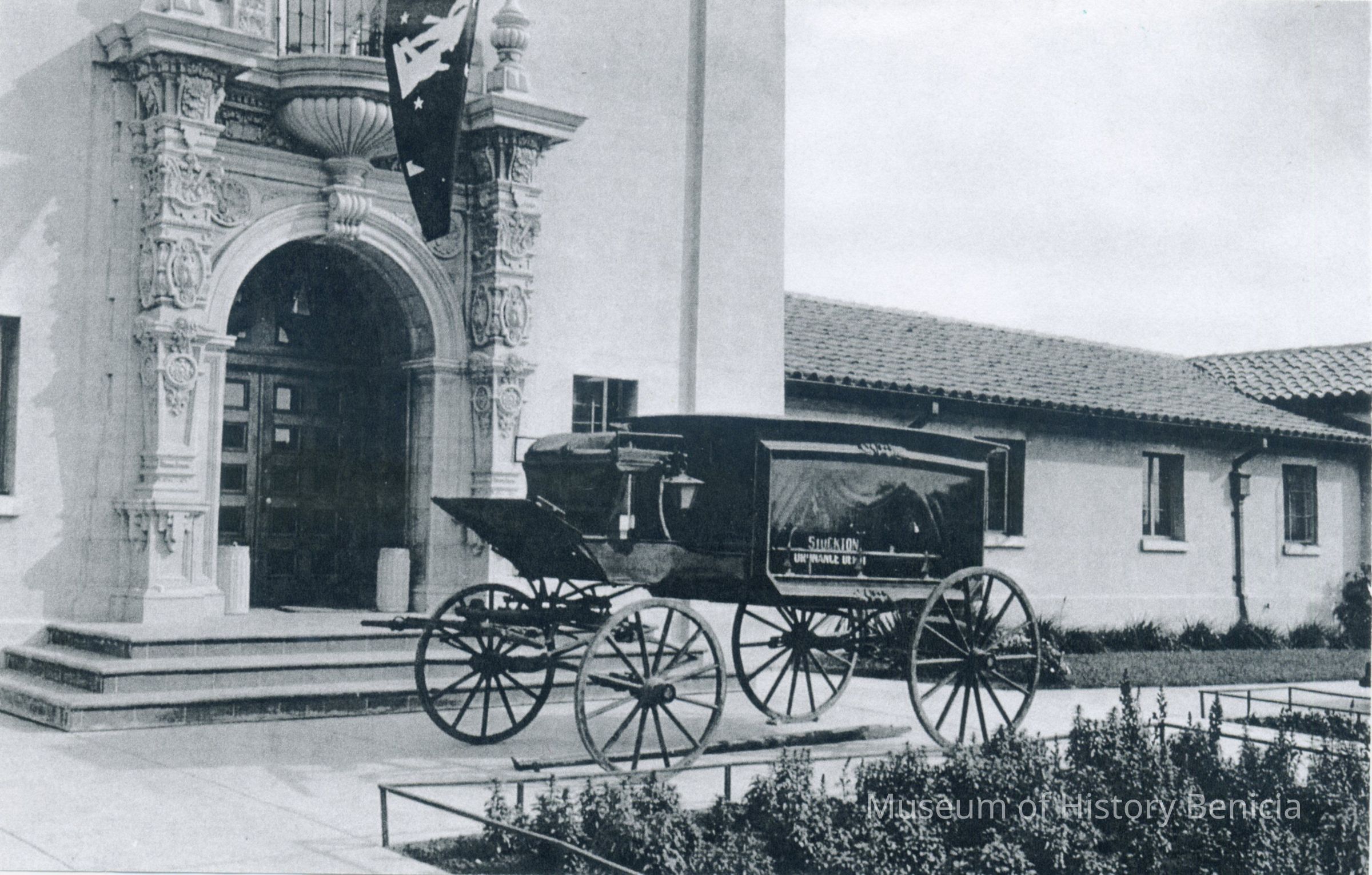 A very fancy hearse in front of St. Dominic's Church. Printed on the side is Stockton and another name that is obscured.