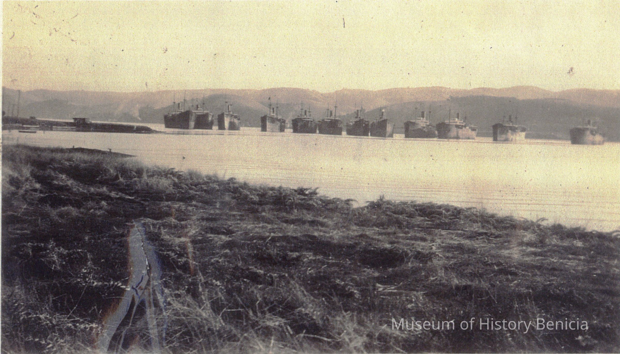 Line of Ships in Southampton Bay. "Thirty-six Class 'A' Steel Freighters of United States Shipping Board in a single line and resting in Lower Southampton Bay. America's Largest Single Fleet Unit in one of America's Greatest Protected Harbors. Photograph taken from Benicia shore near Benicia Ship Building Company's Yards and shows Ferry Slips of Southern Pacific Railway Company extending out into Bay at exreme leftCollection