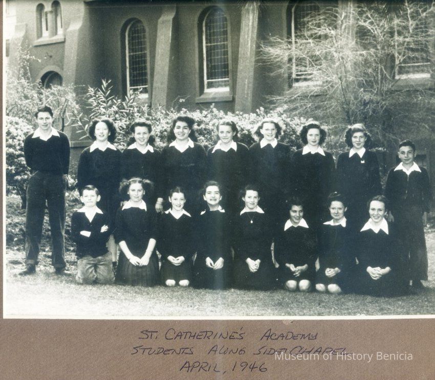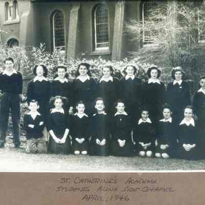 This is a photograph of the class of 1946 at St. Catherines Academy. The names listed on the back are front row left to right: