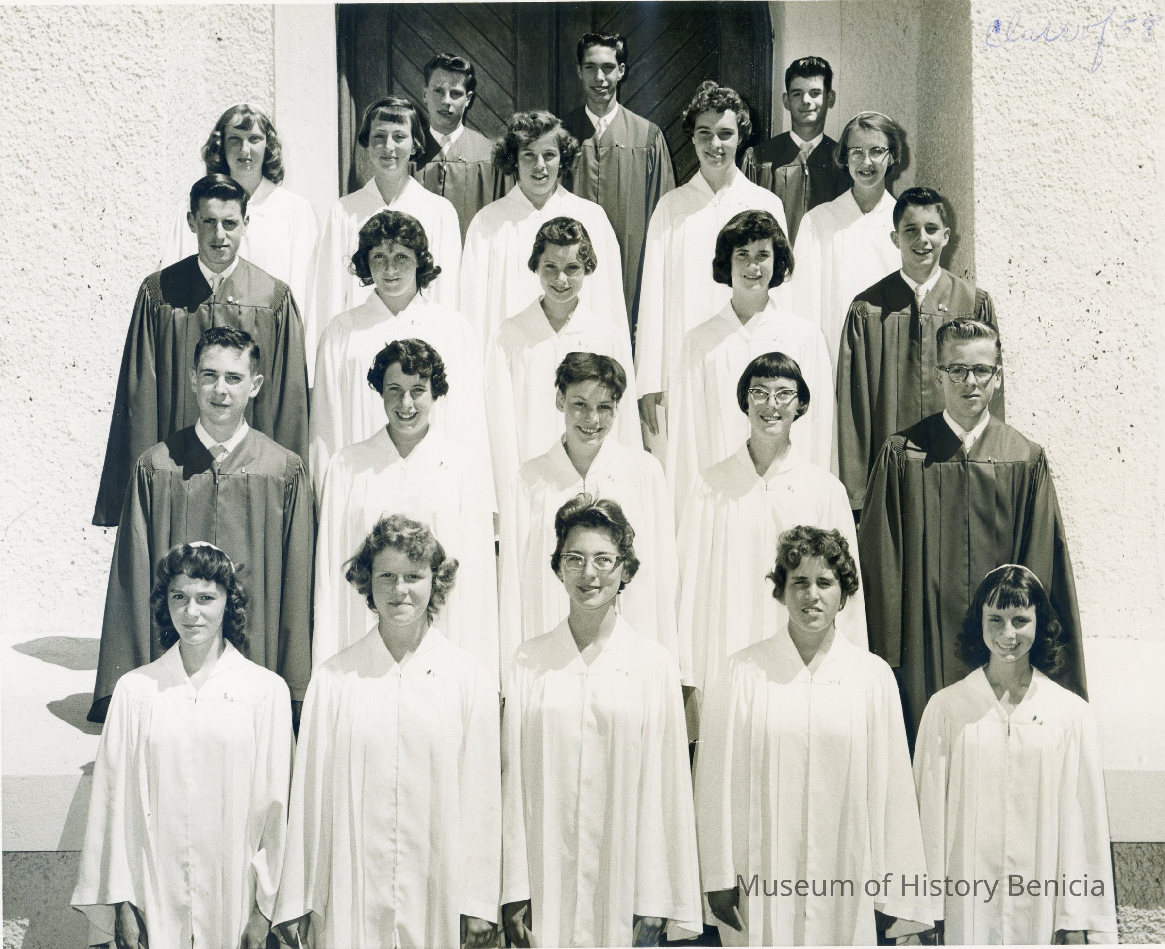 This is a photograph of the class of 1959 at St. Catherine's, one of the last classes to attend there. Among the graduates are Michael Casagranda, Michael Franklin, Joe Garske, Richard Kuppens and Mary Moore.