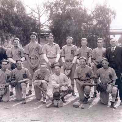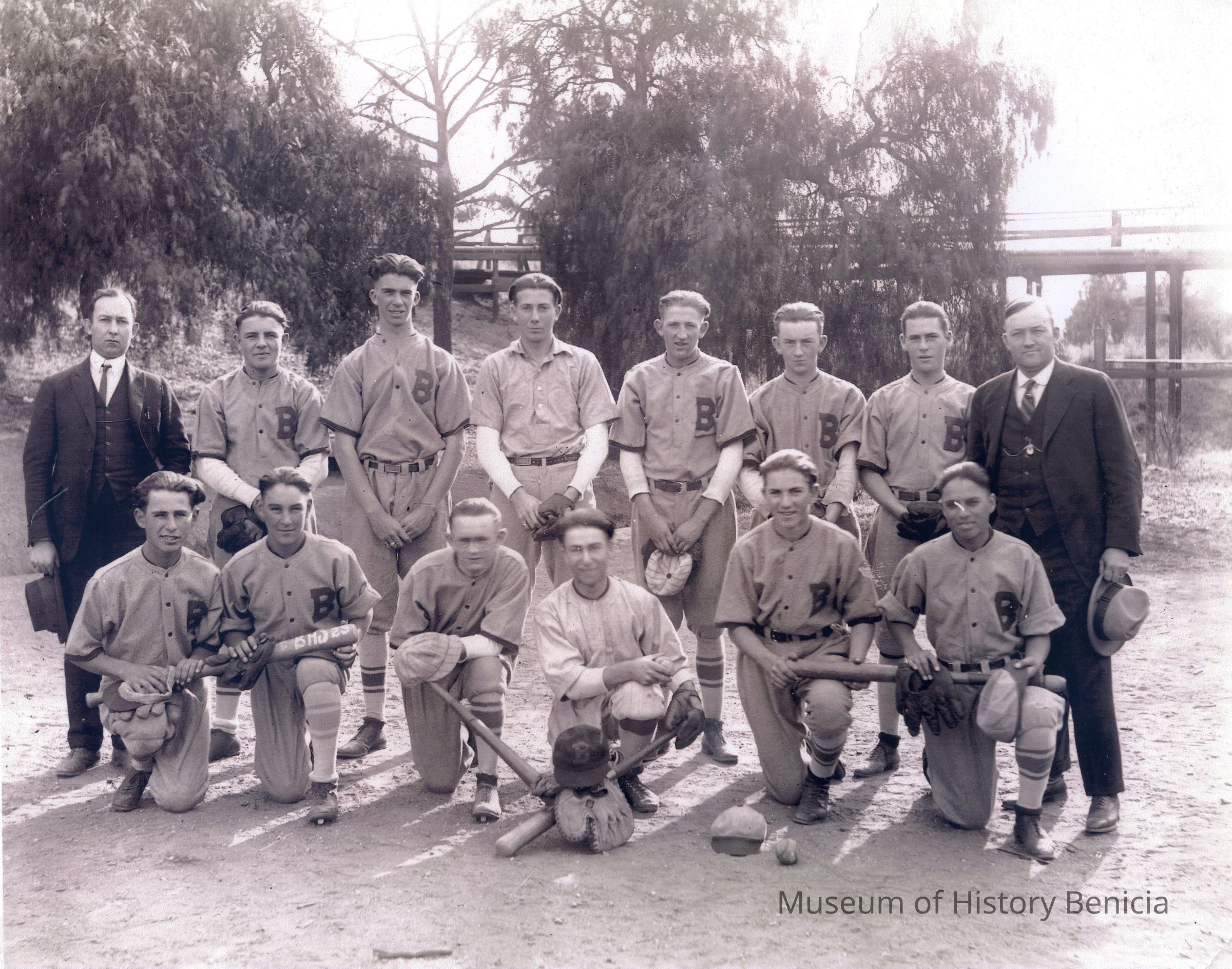 This is a photograph of the Benicia High School baseball team. Written on the bat is "BHS 23 or 29". Probably the team from 1923 or 1929. Some of the same students are in this photo as in the 1923 track team photo. (Percy Eilson is third from left on bottom row and Kenneth McConlogue ios third from left in top row.) So this is probably the 1923 team.Collection