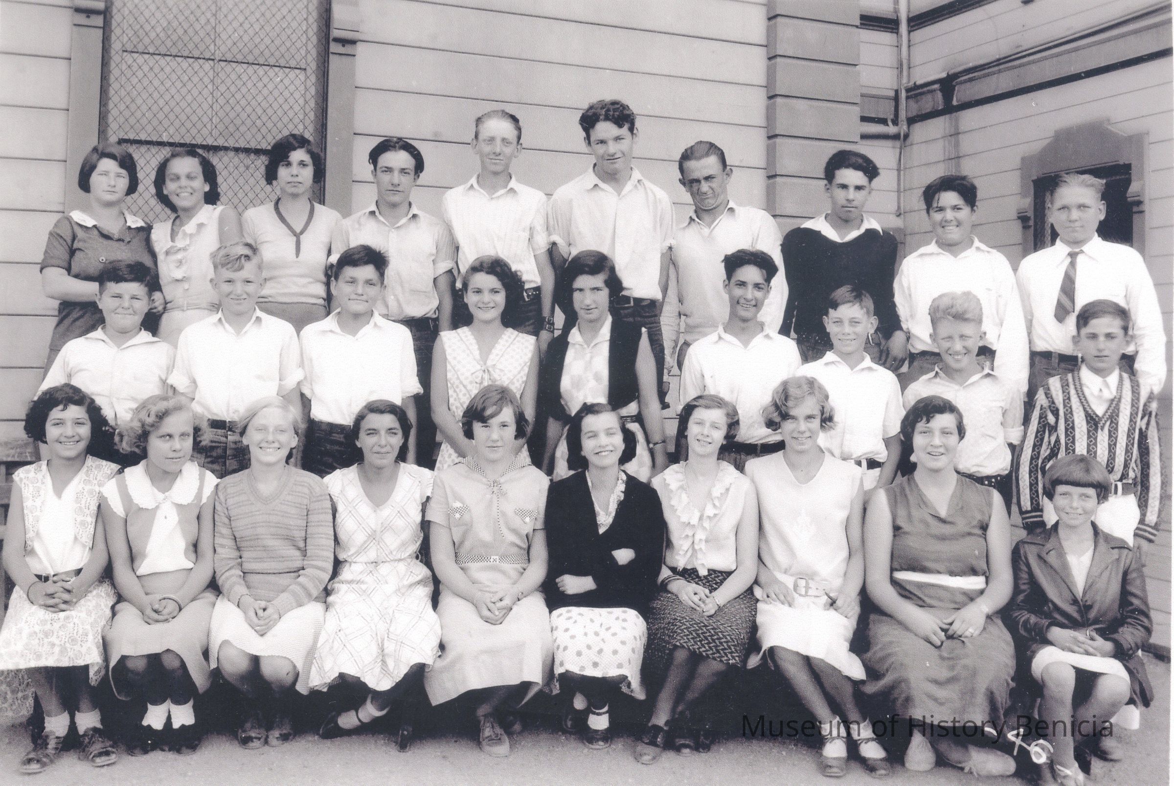 This is a photograph of the 8th grade class of 1931 at the old Benicia Grammar School. Fourth from the right in the bottom row is Donna Dimmick's mother-in-law Dorothy Jane Wilson, daughter of Roland Wilson and Dorothy Gise. She was daughter of Roland Wilson and Dorothy Gise.Collection
