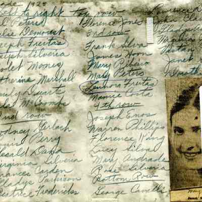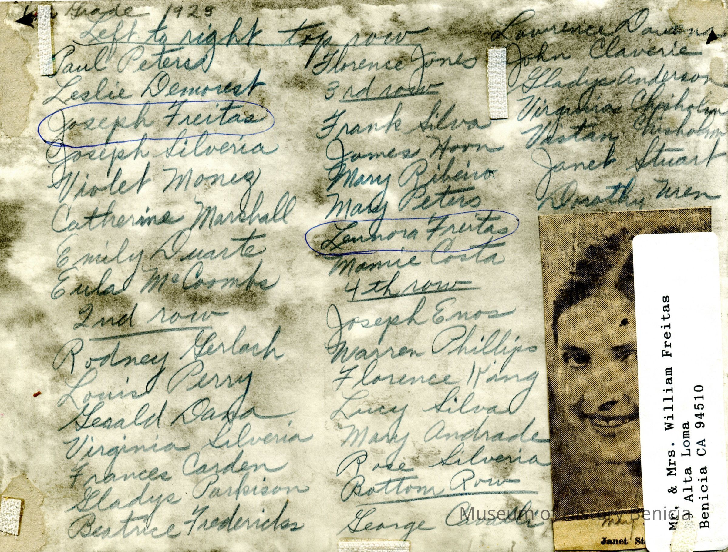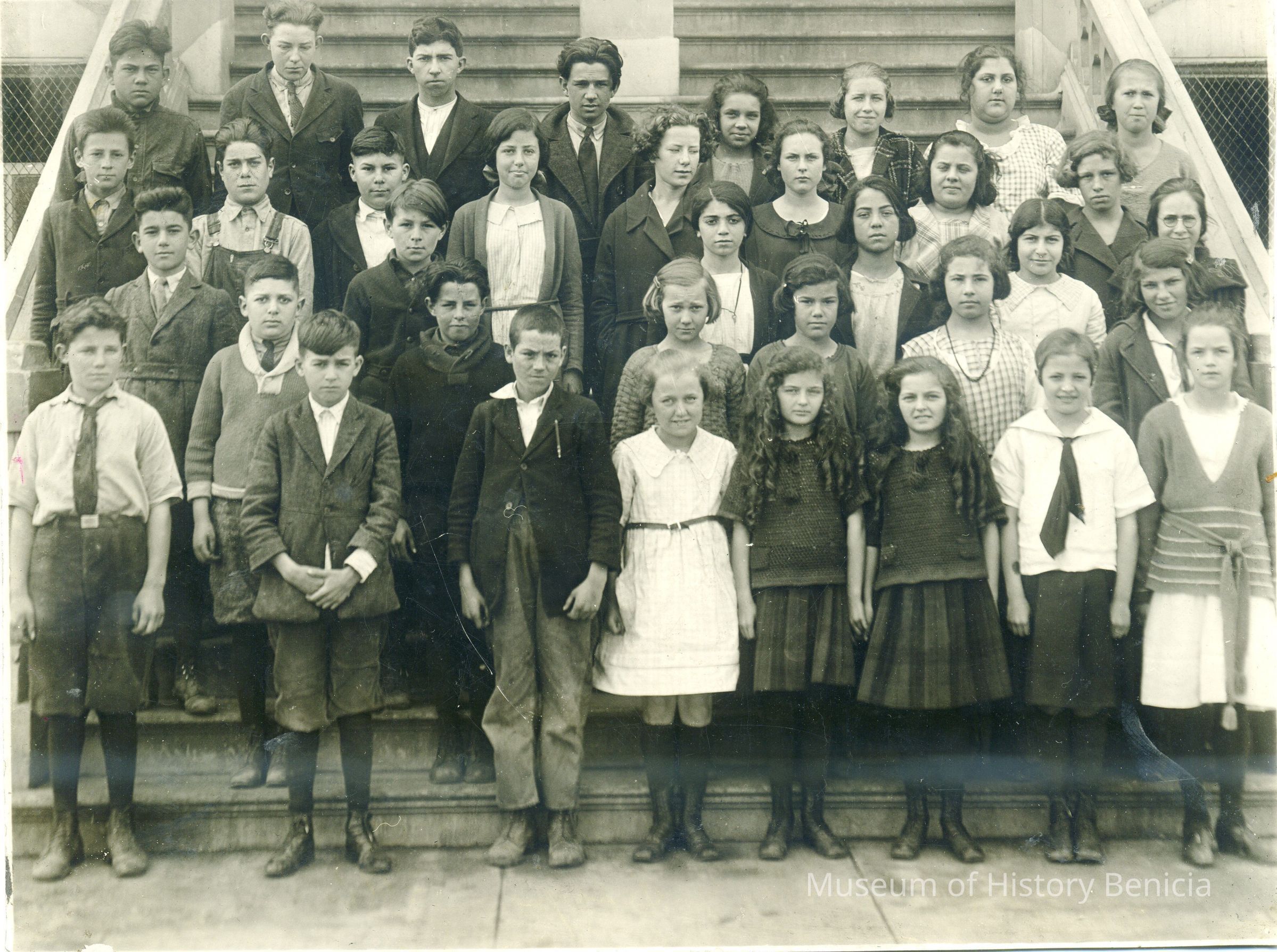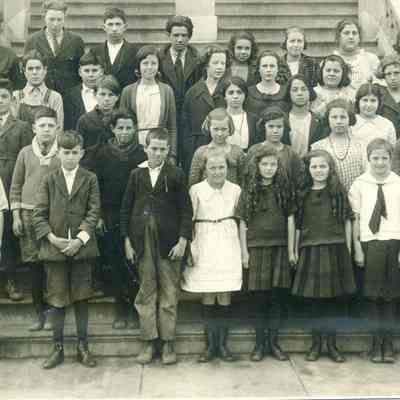 This is a school class photo. It was taken on the steps of the old grammar school. The year taken is 1925 and it looks like the grade is 6th grade. There is a newpaper clipping on the back of Janet Stuart. It is partially obscured by the address sticker. The names shown on the back are: