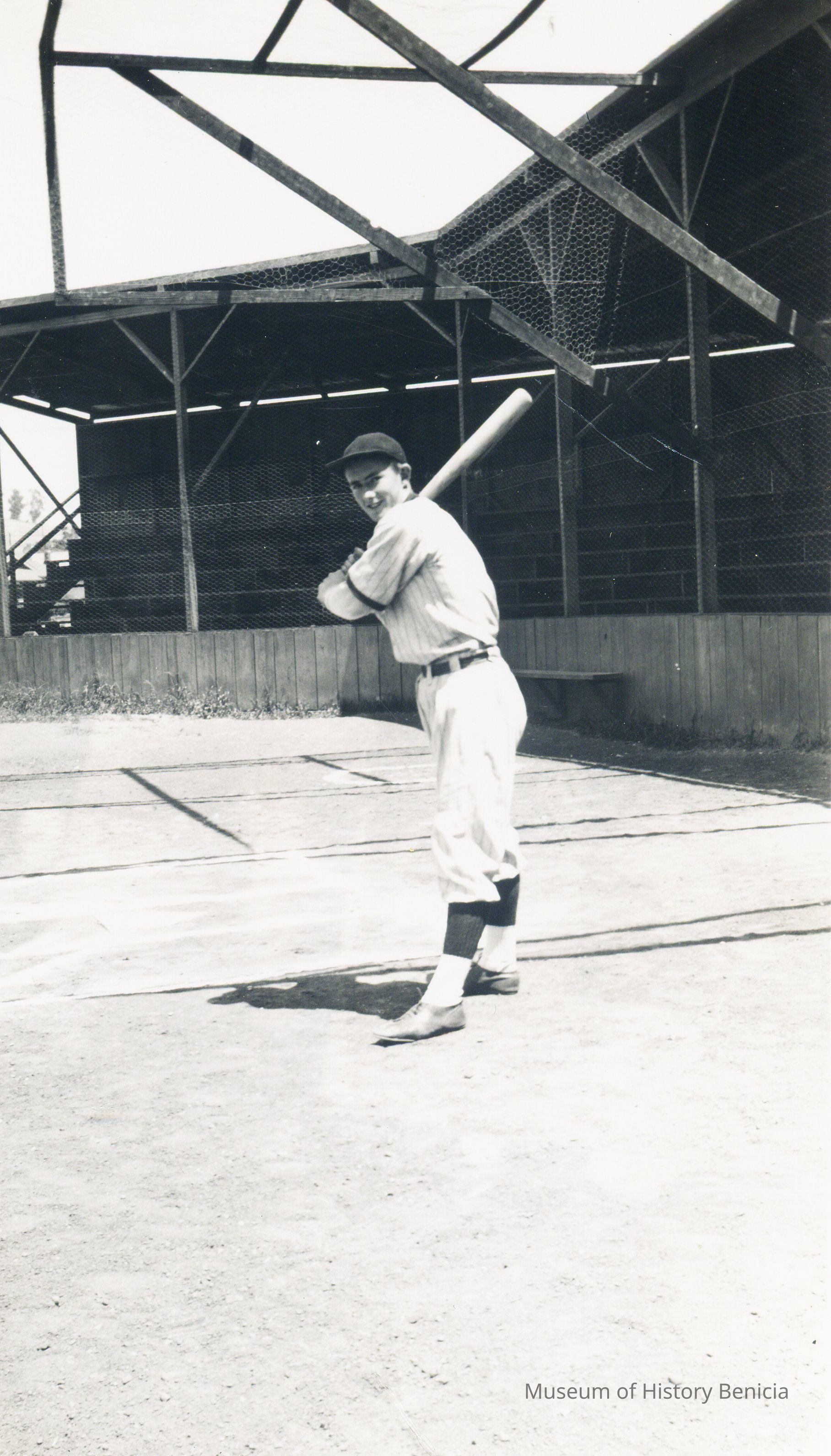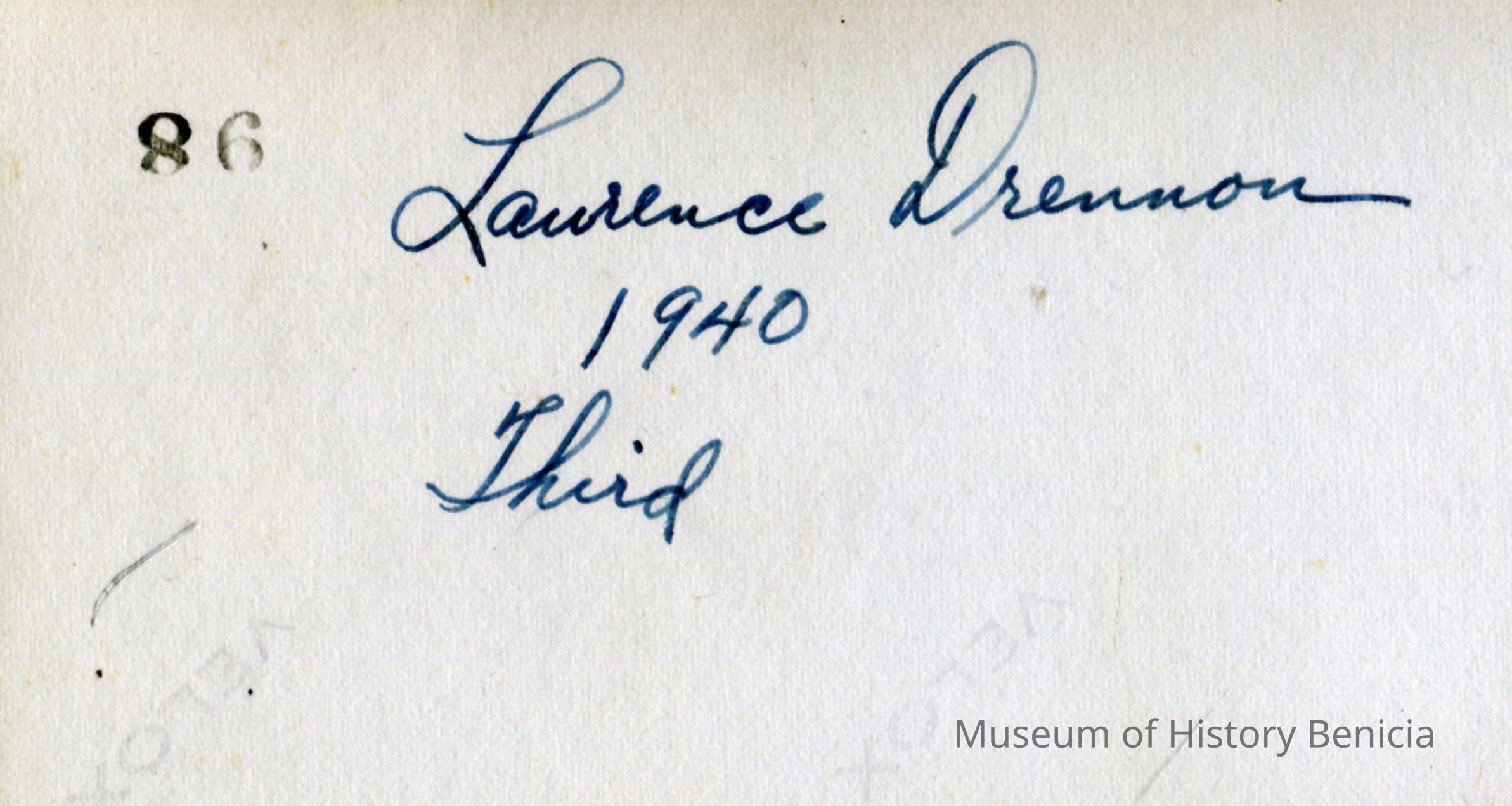 This is a photo of a Benicia baseball player. He is identified as Lawrence Drennon, a third baseman and the photo was taken in 1940.