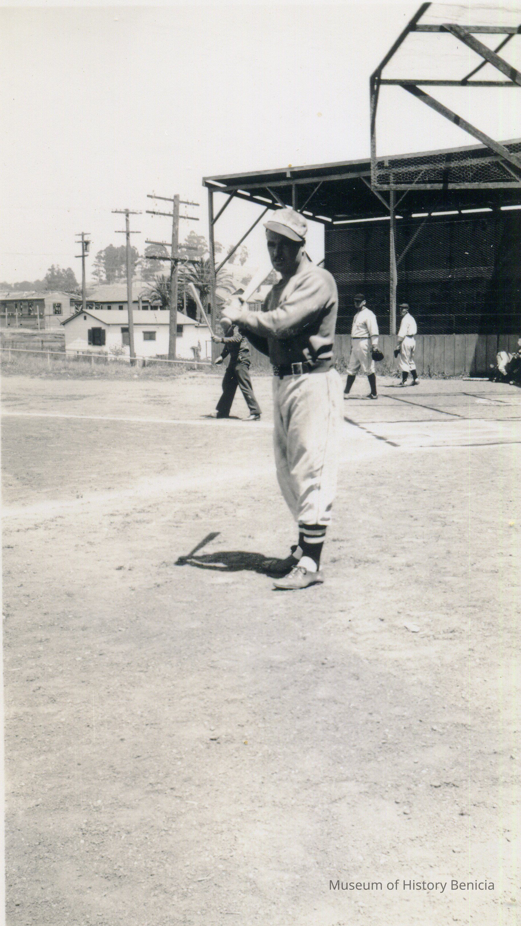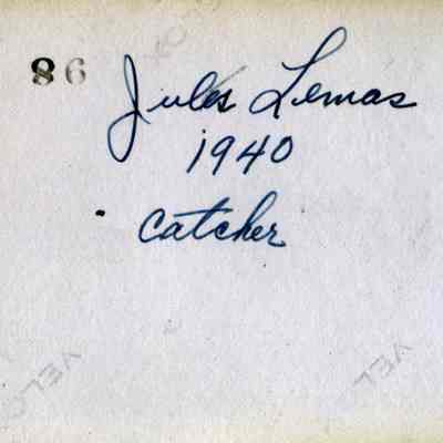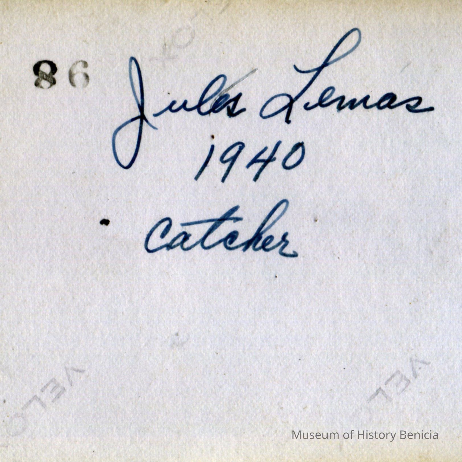 This is a photo of a Benicia baseball player. He is identified as Jules Lemos, a catcher and the photo was taken in 1940.