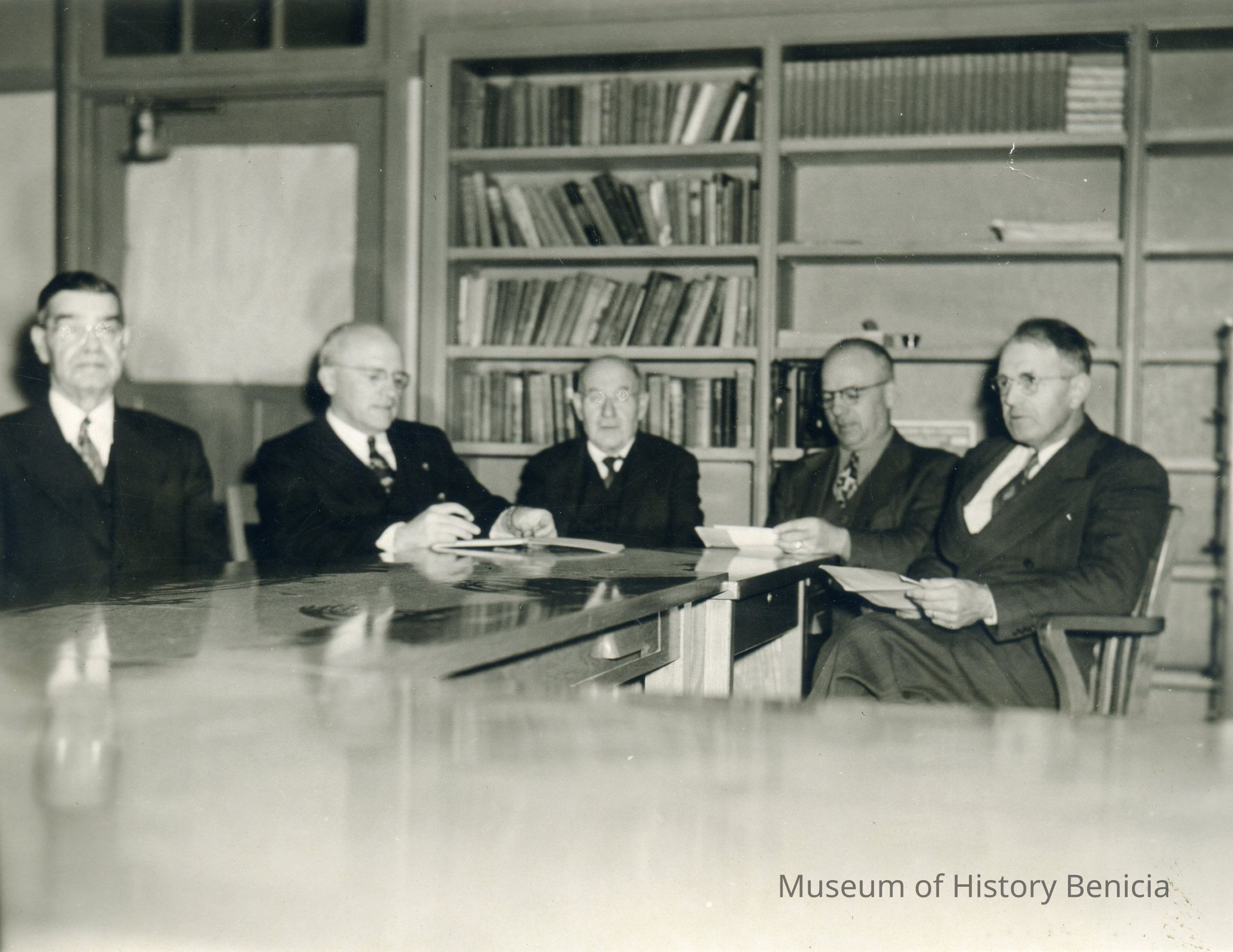 This is a photo of men around a counter. The back says "Benicia Main Street" and a number (74931). Not sure who is in the photo or the purpose of the meeting. It may be in the Benicia library.Collection