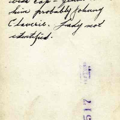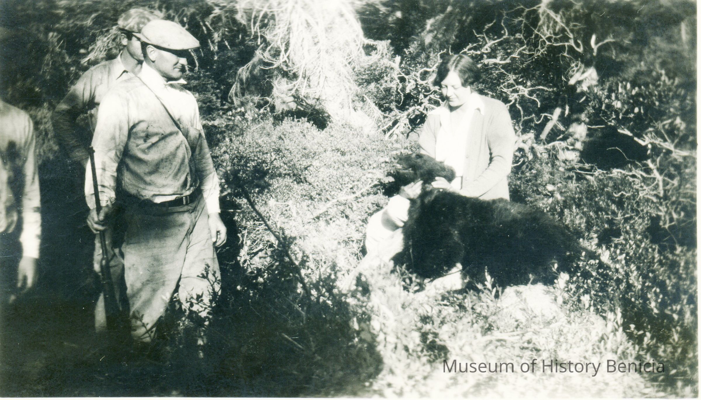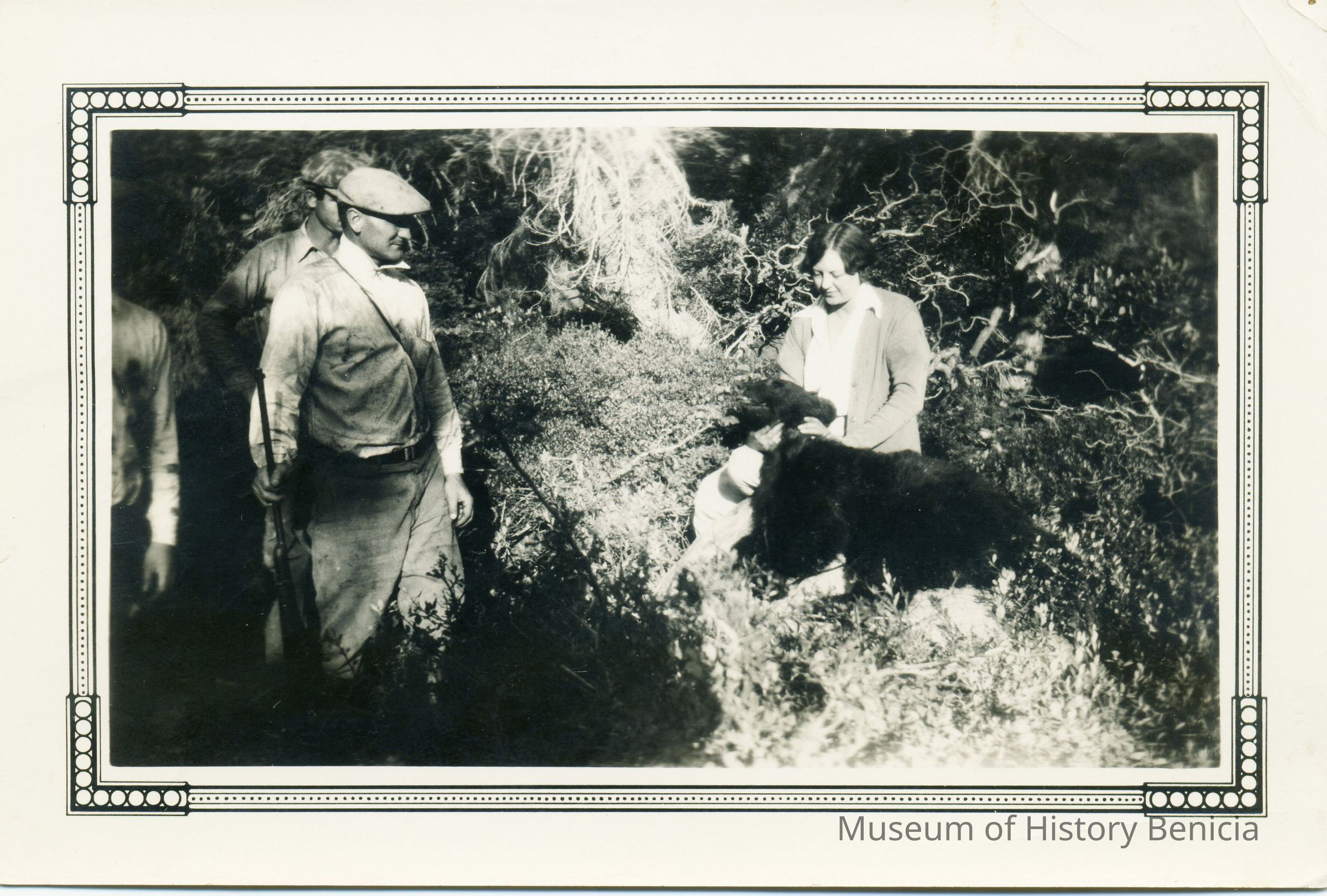 This is a photo of two men and a woman with a big dog. They are identified as Wallie Wassmann Sr. (with cap) and Johnny Claverie. The woman is not identified.Collection