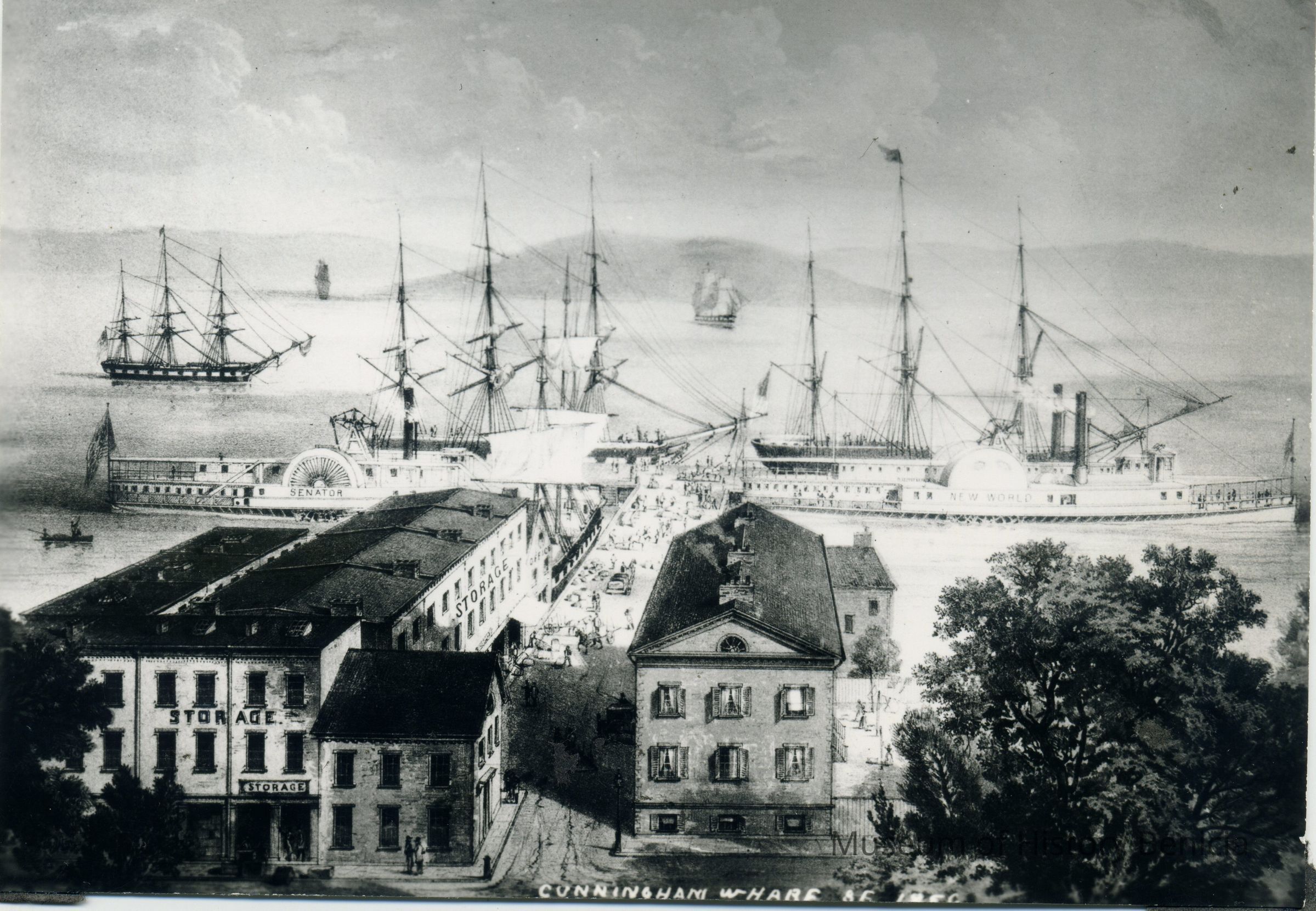 This is a copy of a photograph in San Francisco on the Cunningham Wharf. It shows ships in the Bay including the riverboat Senator and New World. It came from the S.F. Maritime Museum collection.Collection