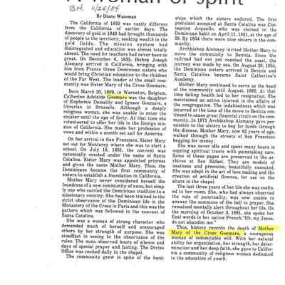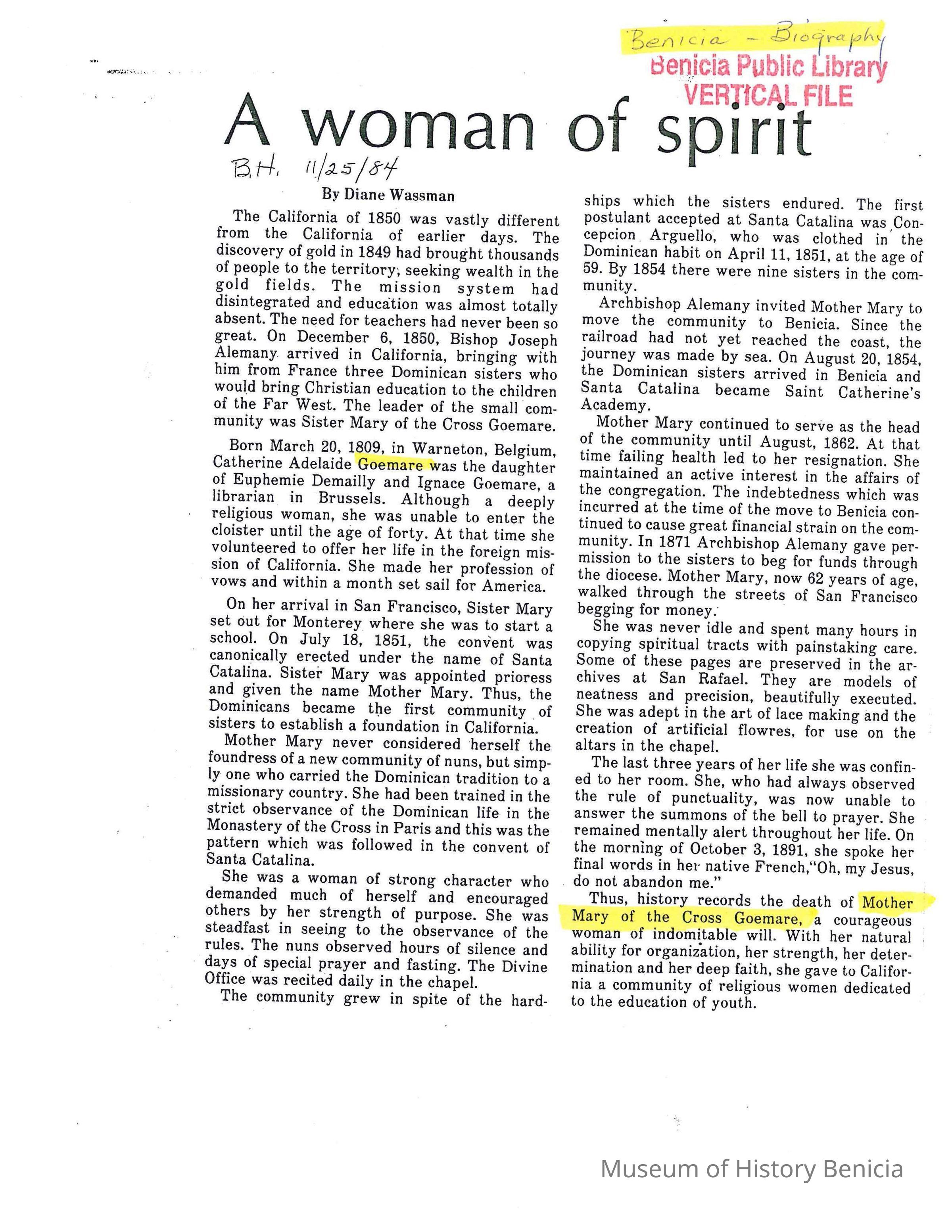 Also attached is a biography of Mother Goemaere from the Benicia Herald.Collection