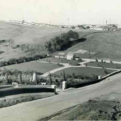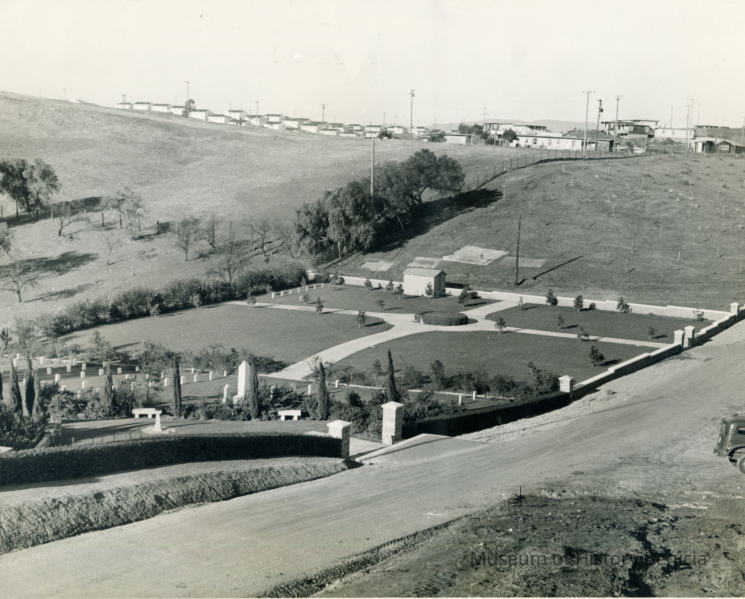 This is a photograph of the Benicia Military cemetery. It shows the Northern addition having been completed for the prisoner-of-war graves.Collection