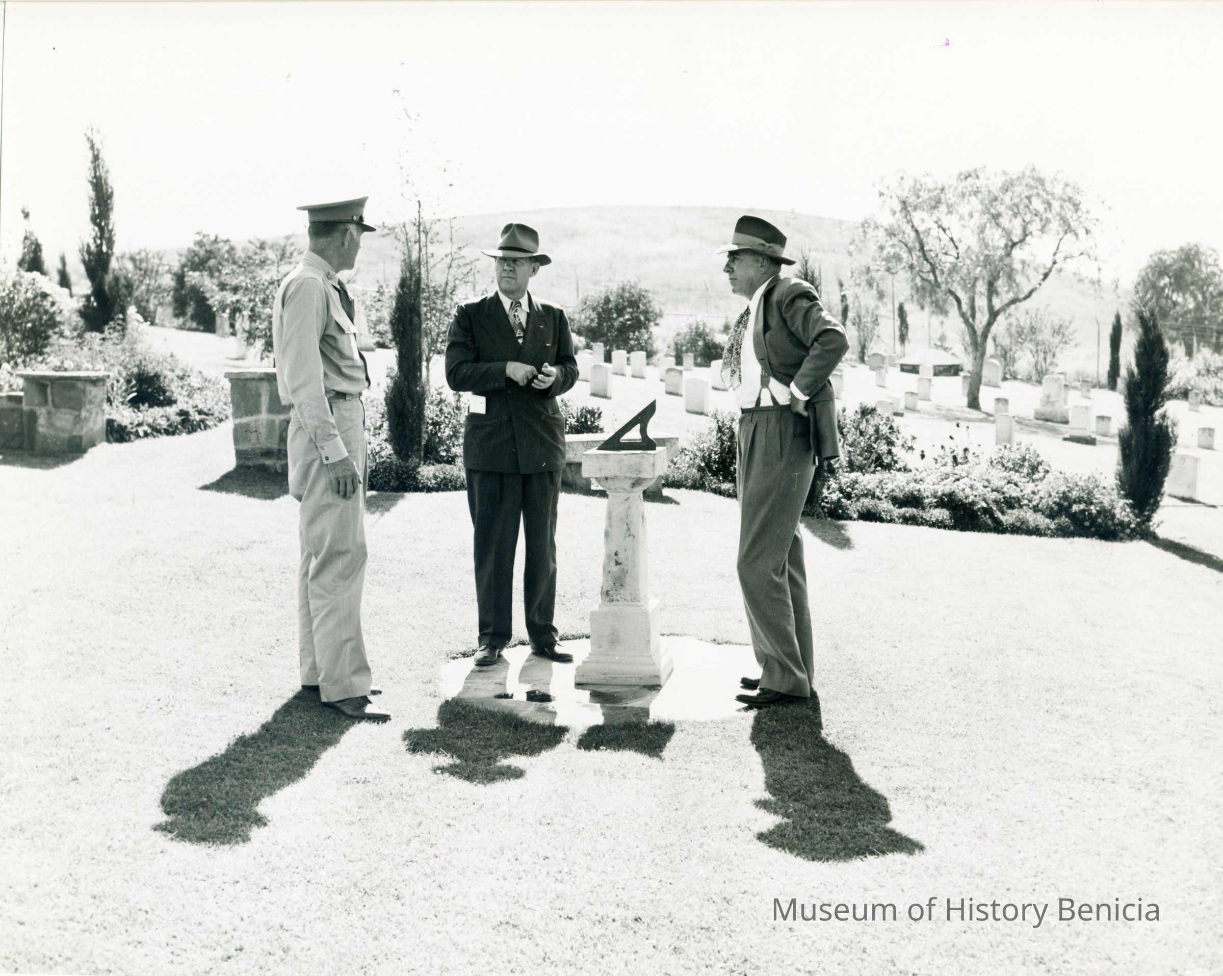 This is a photograph of the Benicia Military cemetery. It shows three men, two civilian and a military officer, looking at the sun dial in the cemetery.Collection