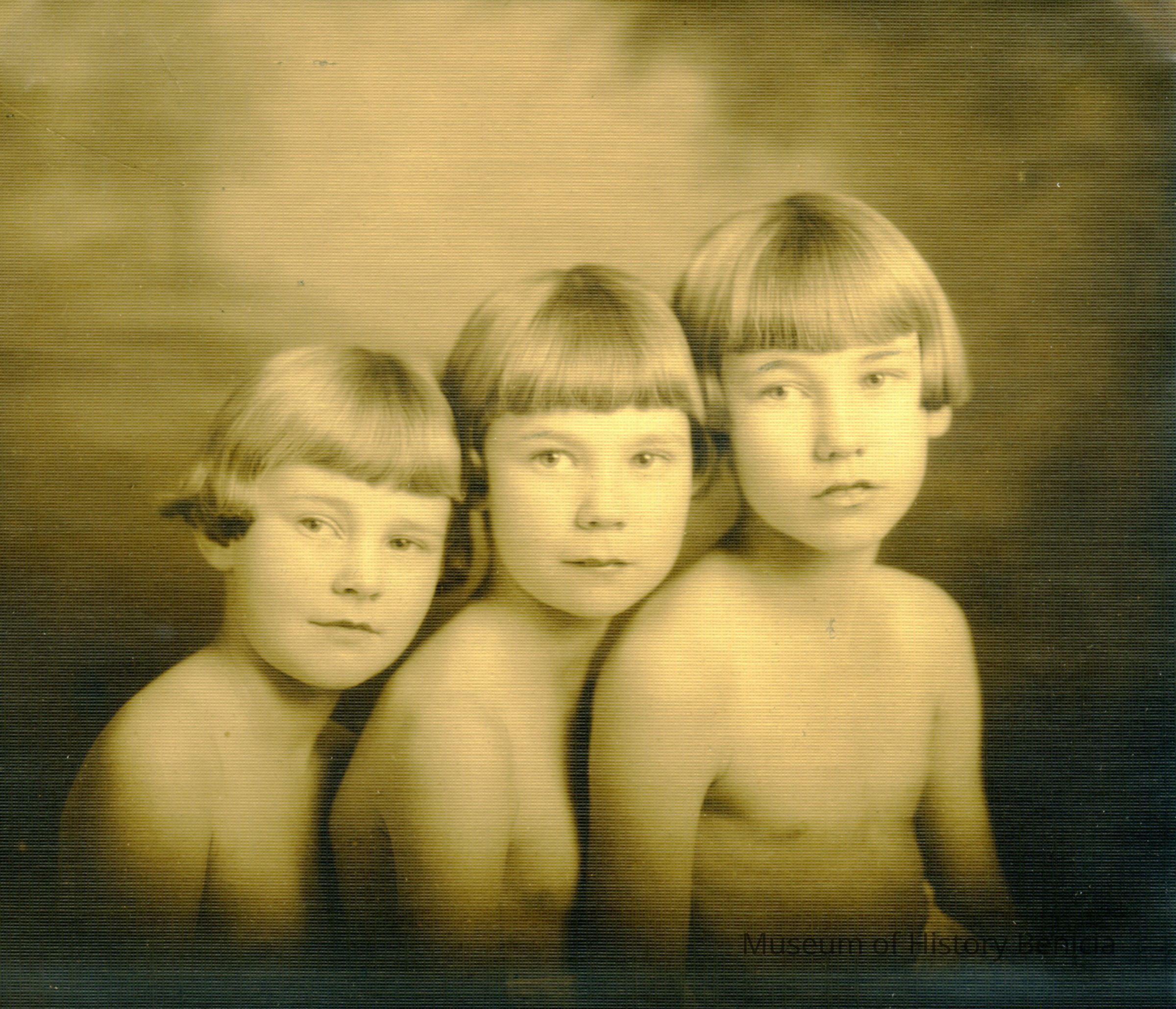 This is a studio photograph of three young children. No identification on the back.