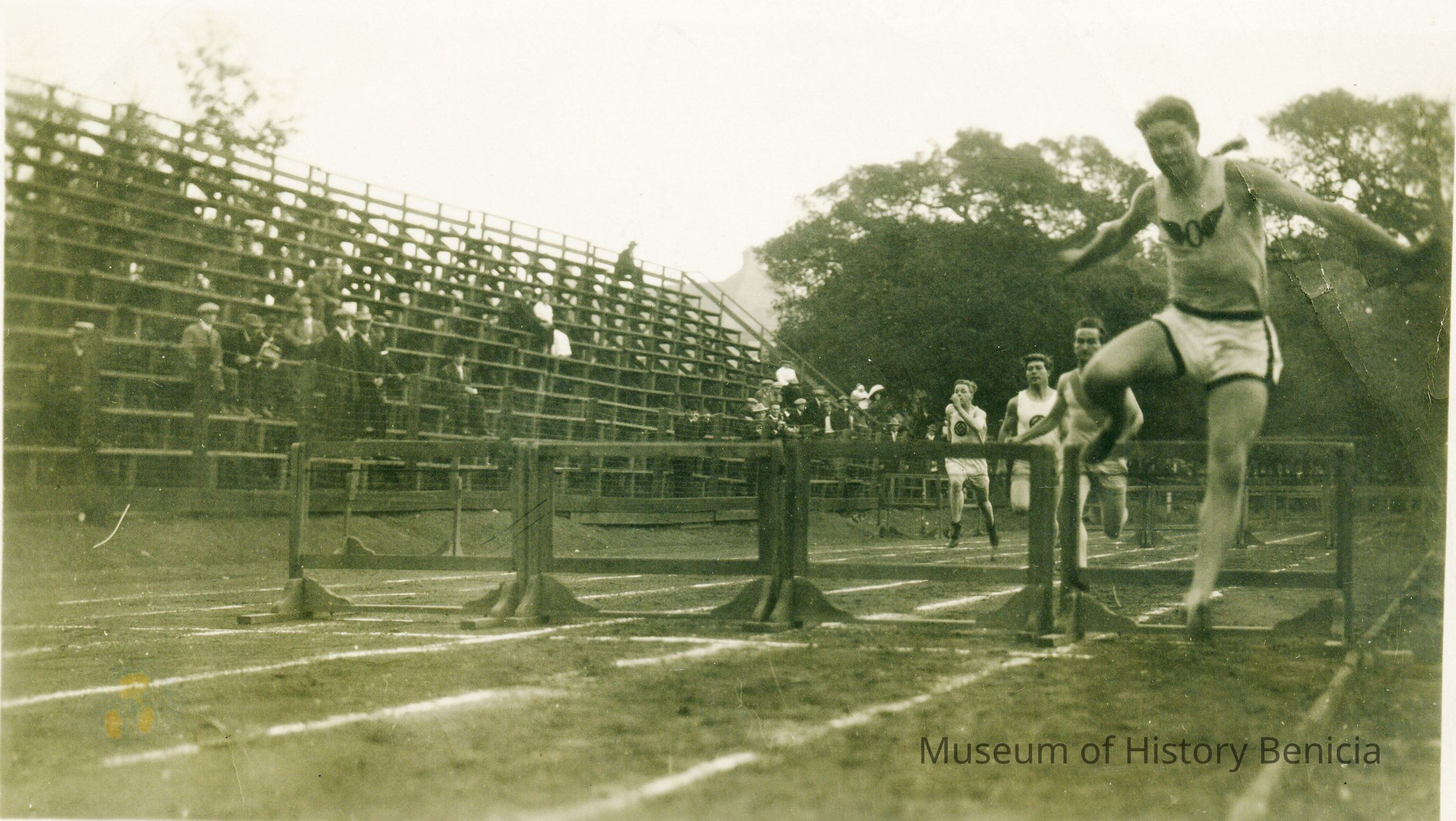 This is a photograph of a race running hurdles. The boy in the lead has a flying "O" symbol on his shirt. The two on the left have a circle with a diamond inside design.Collection