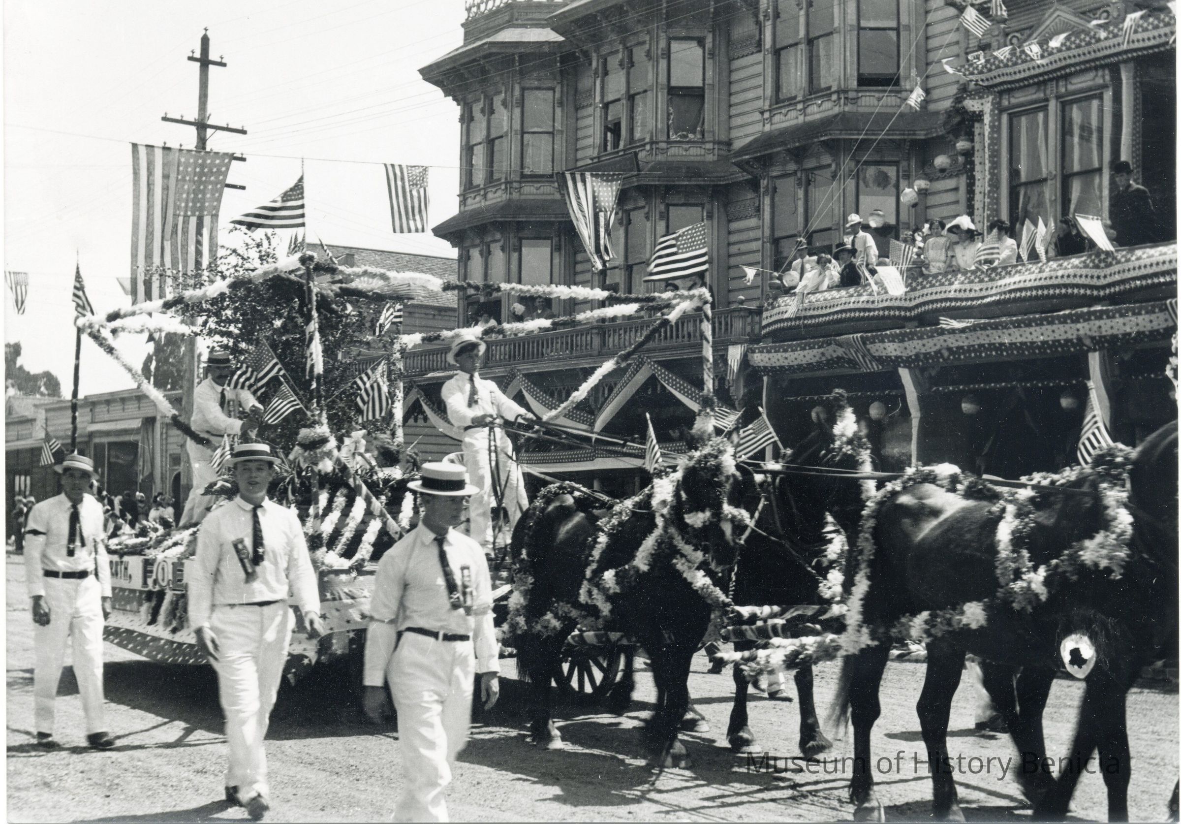 This is a photo of an early Benicia parade wagon. It shows a wagon decorated in flowers with young men in straw hats on and around the wagon. They are wearing ribbons of some sort. On the side of the wagon it says "F.O.E." which is probably Fraternal Order of Eagles.Collection