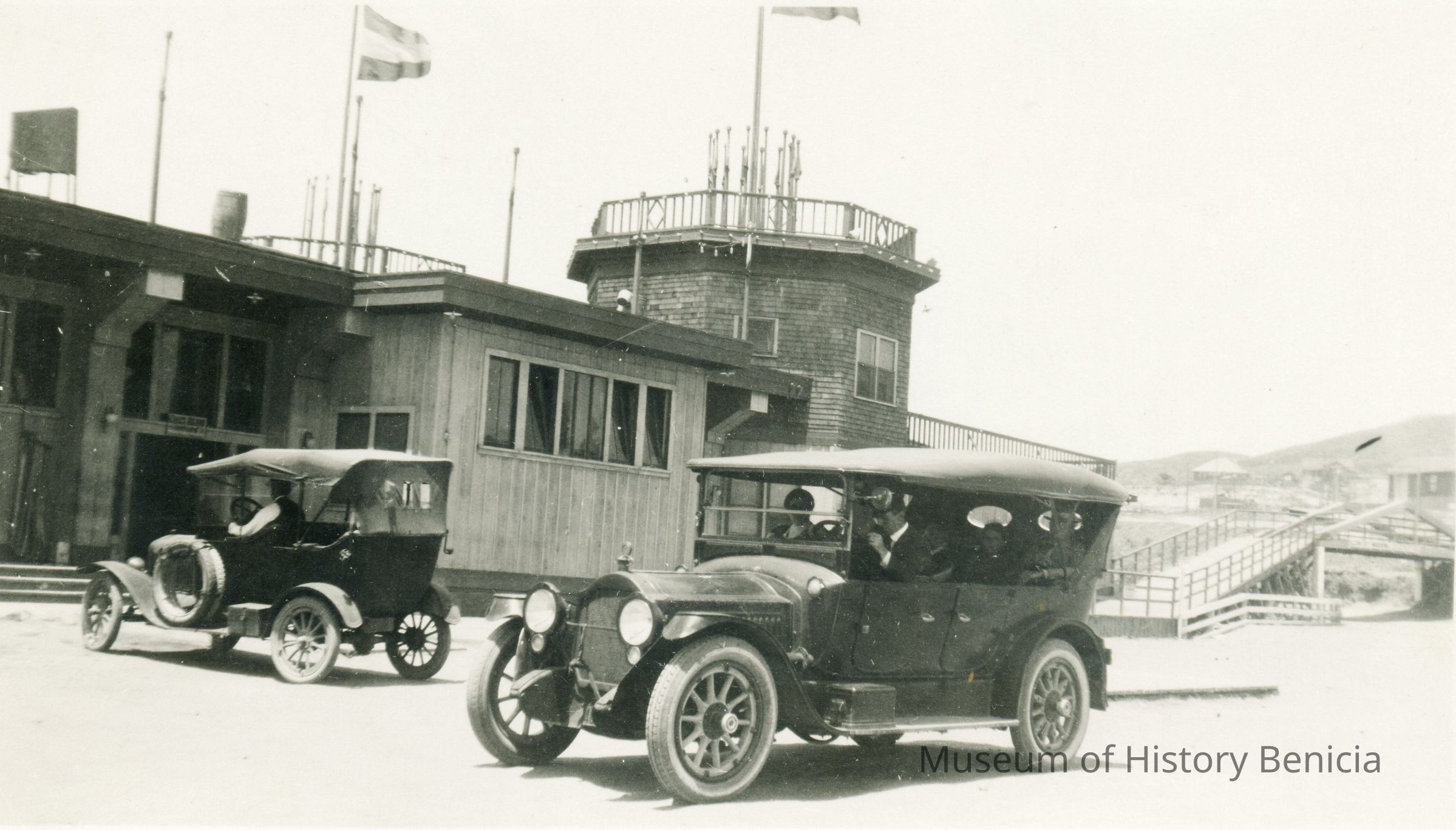 This is a photo of two cars in front of a building with two round towers at one end. This could be a border crossing. There is a sign visable over the doorway but it is not readable. The flag flying is not recognized.Collection