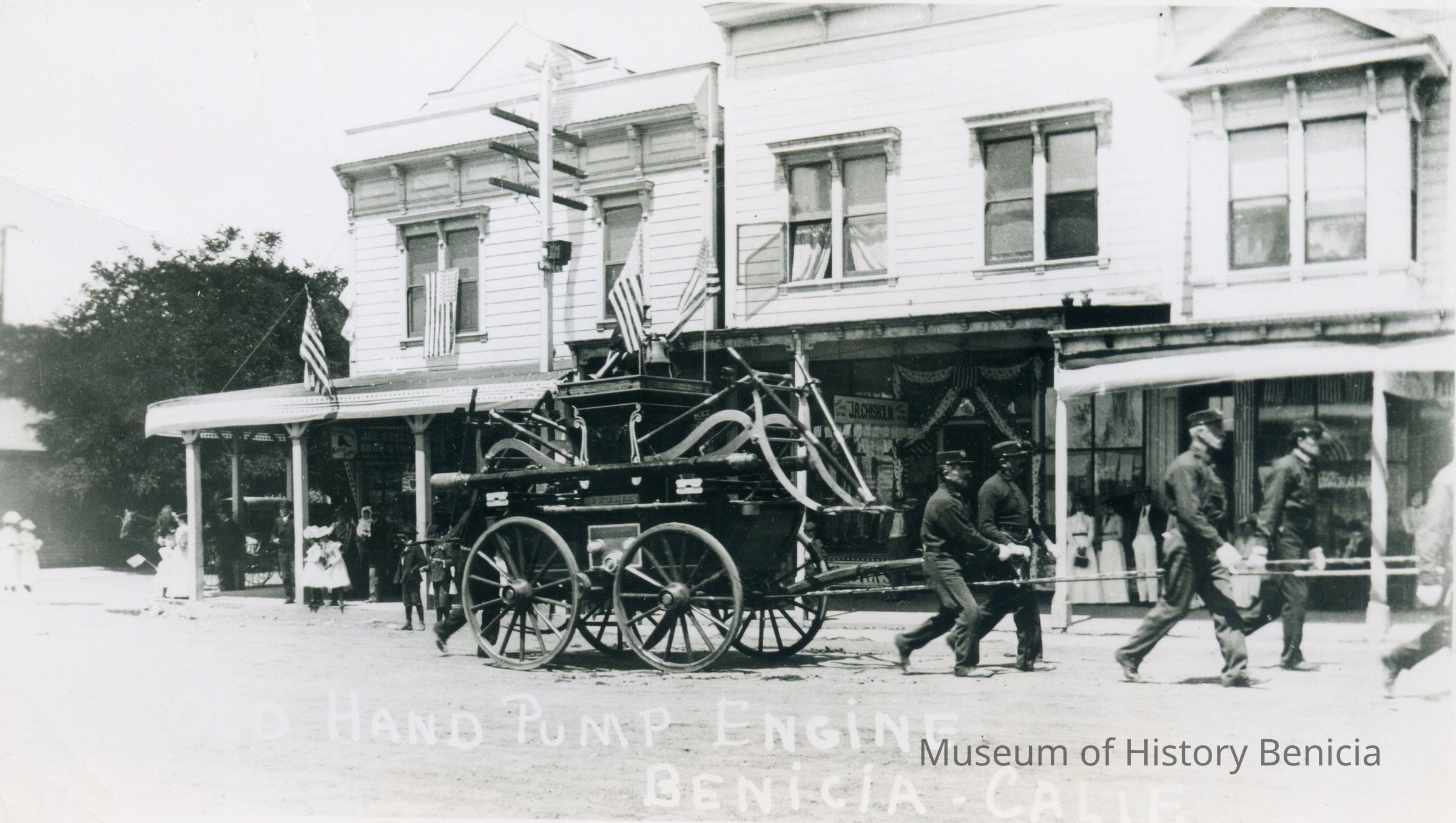 This is a photo of the old hand pump engine from the Benicia fire company. This may have also been made into a postcard.