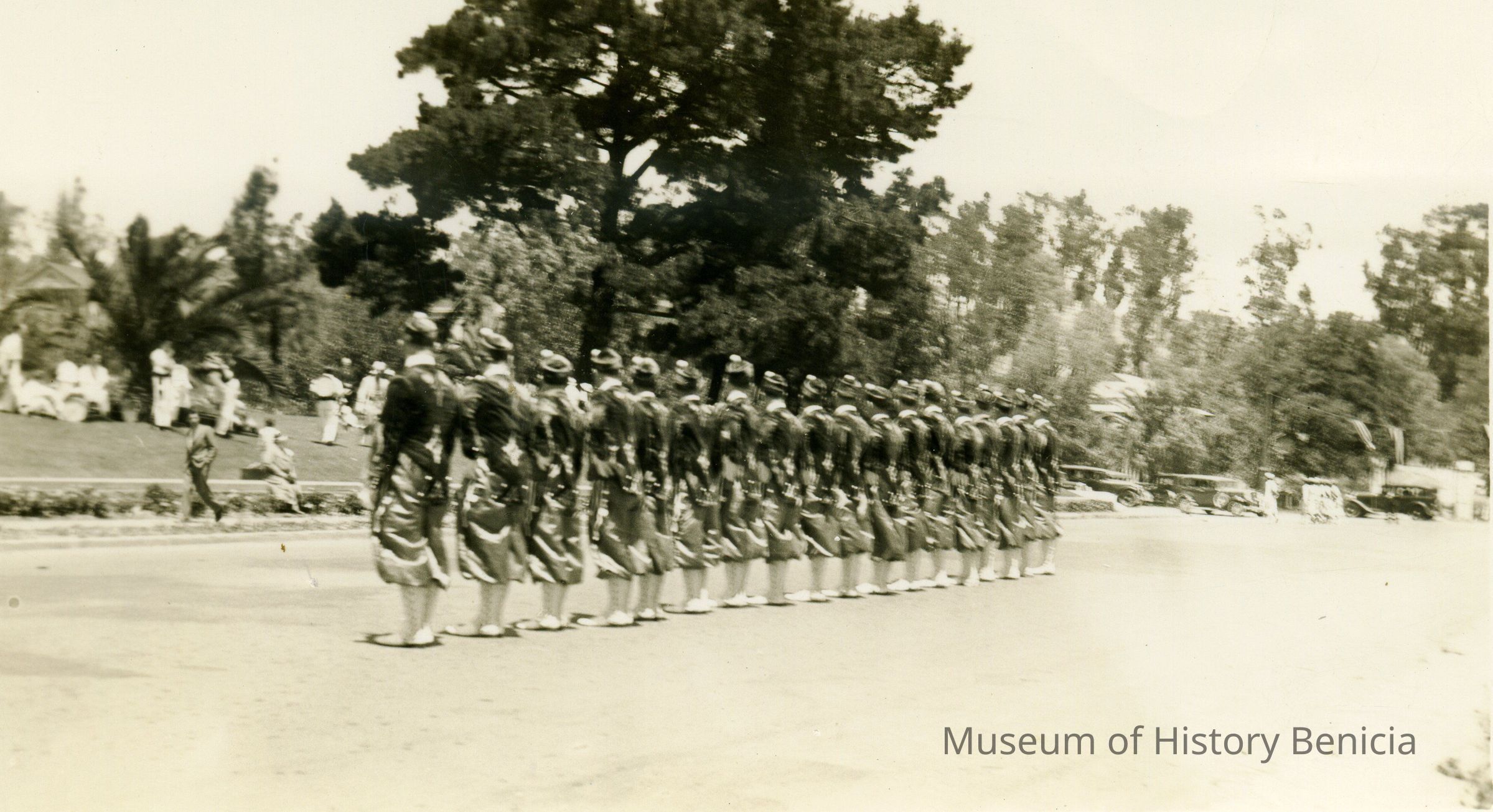 This is a photo of a group of men or maybe young women in uniform on Sanborn field in Benicia. The photo is too blurry to make out any details.Collection