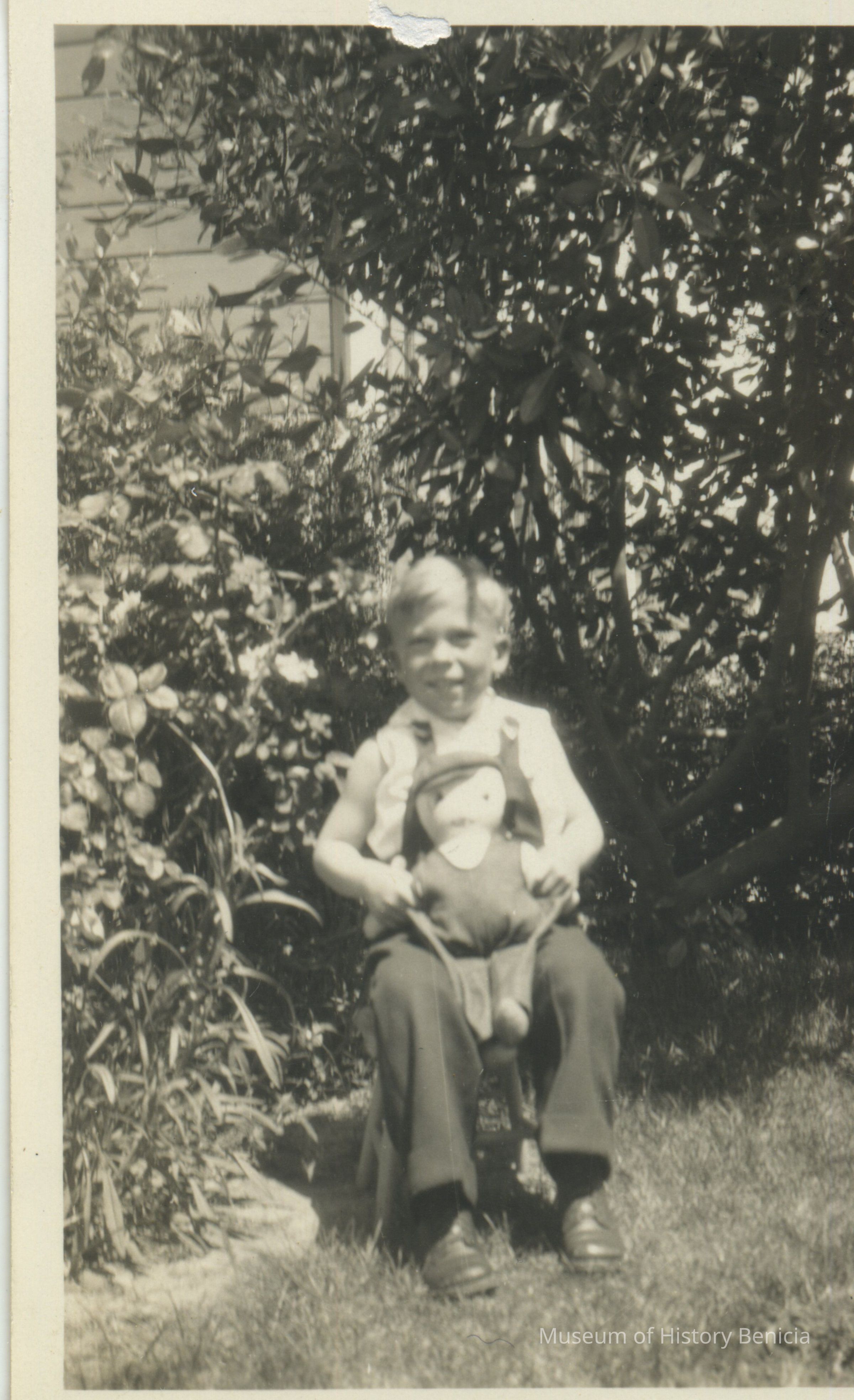 This is a photograph of Tom Malicki as a very young child, around 2 years old, sitting in a small chair, holding his "Jimmy Doll."