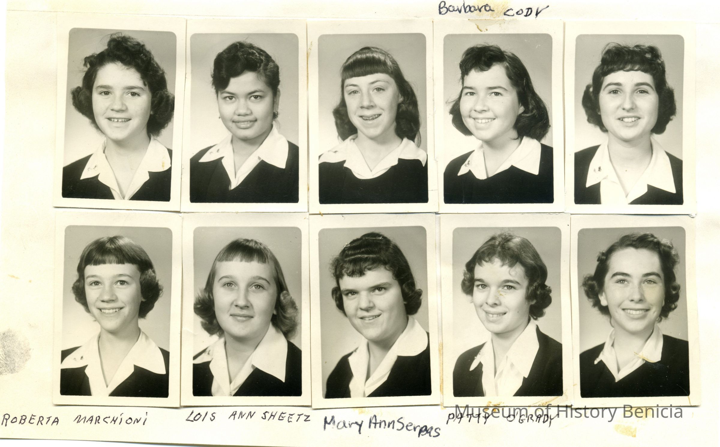 This is a series of small photographs of students from St. Catherine's Academy. A few are identified but the year is not shown (it is 1958). It identifies 5 girls. They are identified in the photo as: