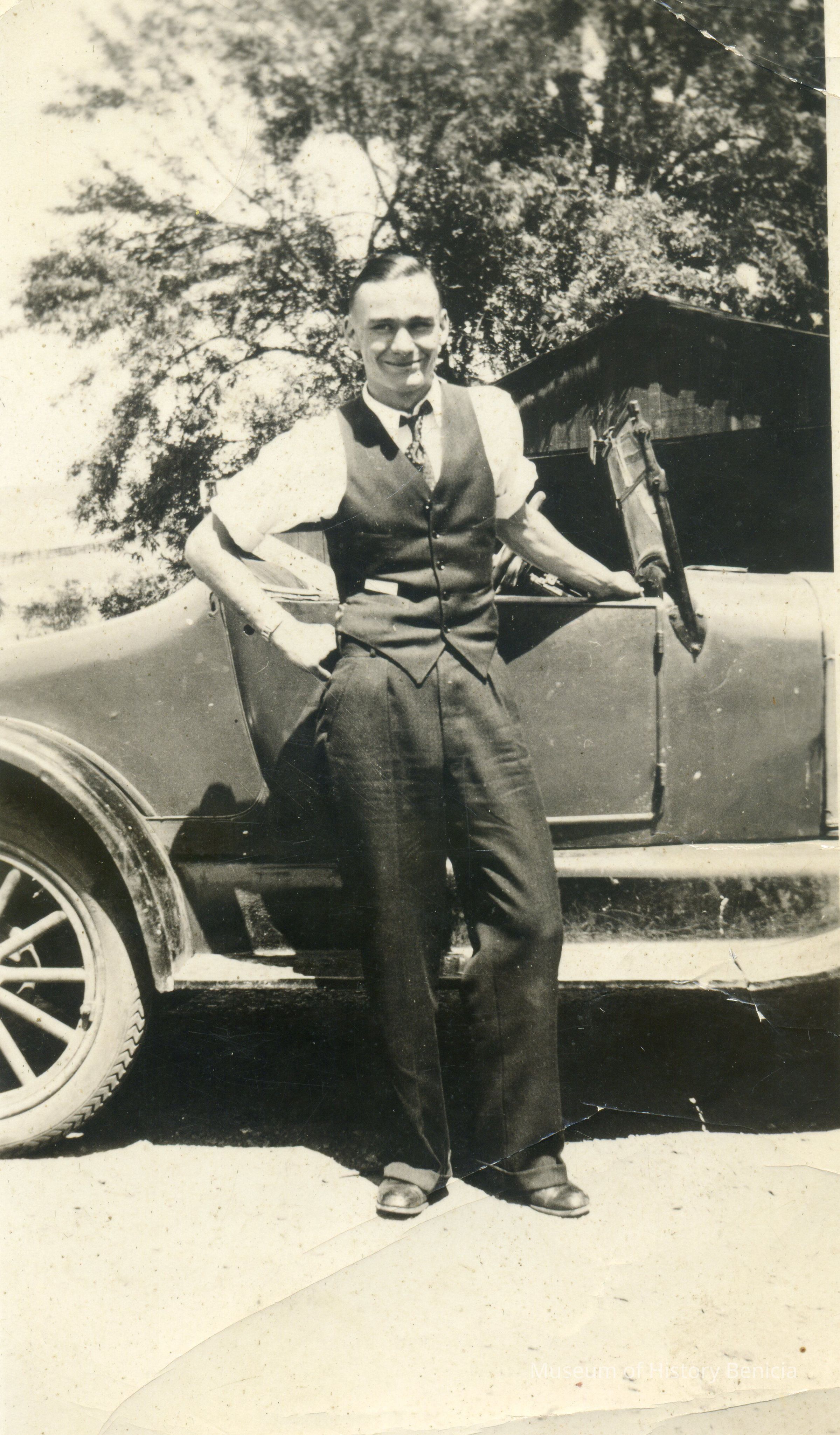 This is a photograph of Walter G. Wassmann Jr. next to a car. He is wearing a tie and vest and looks very happy.