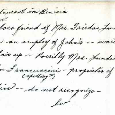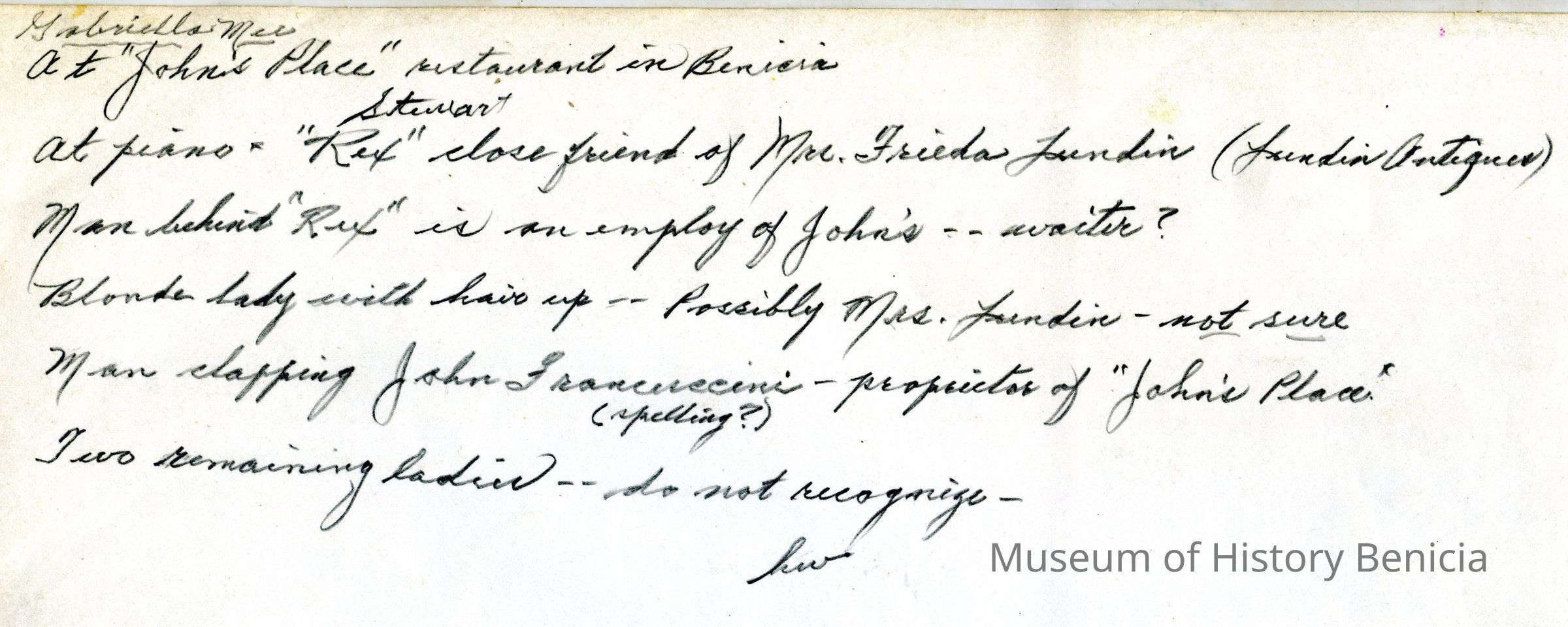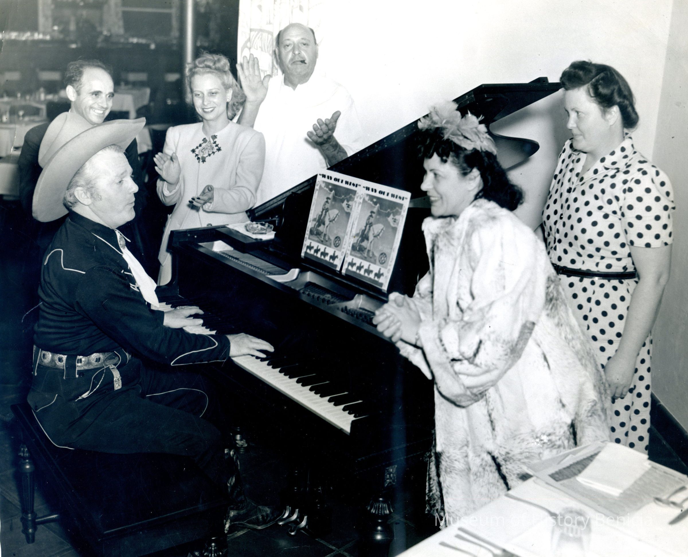 This is a photo of the Rex Stewart in cowboy outfit at the piano, a waiter from John's Place standing next to Rex, Mrs. Lundin next to him and the owner of John's Place, John Francescini.Collection