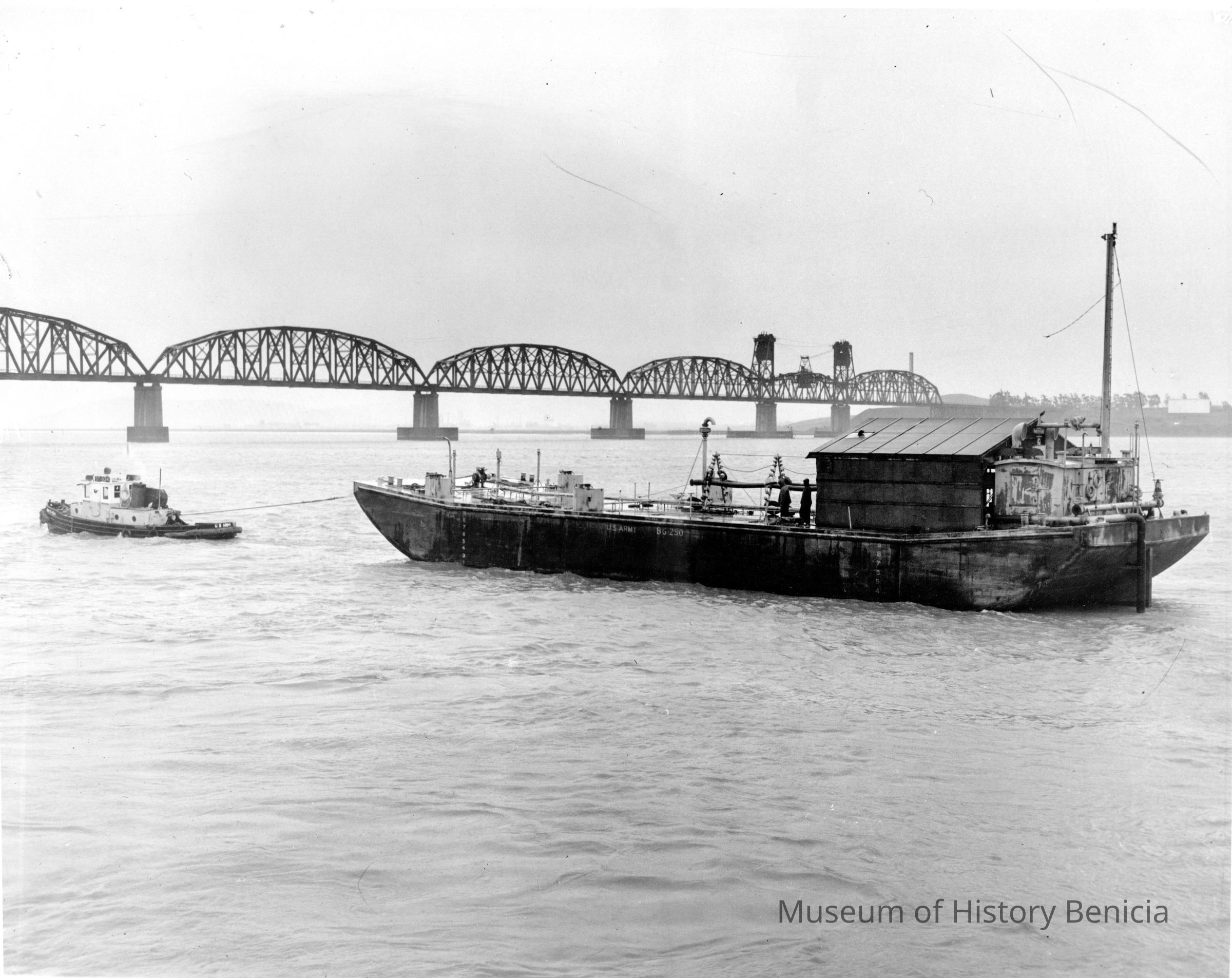 This is a photo of a tug pulling an Army barge next to the Benicia - Martinez RR bridge.