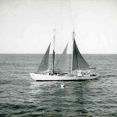 This is a photo of a sailboat with someone in a small rowboat near it.