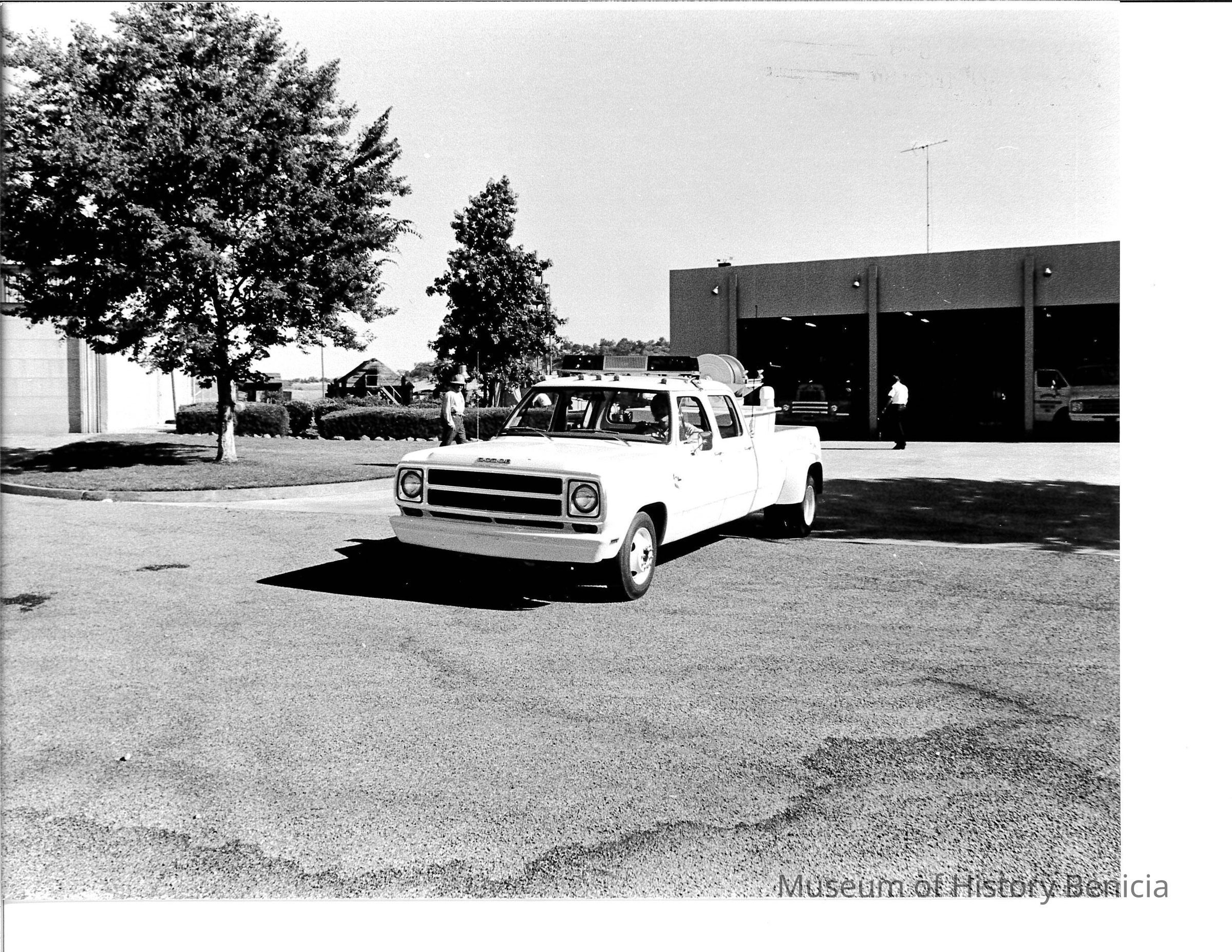 Black and white photograph of a Dodge with hardline hose