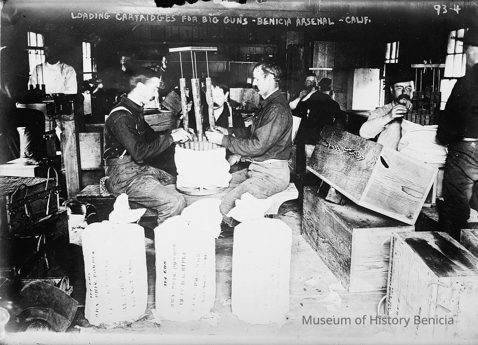 Photograph of several men loading cartridges (in 114 pound circular sacks) for big gun 12-inch rifles circa 1900. These cartridges were made for Battery Kirby, an Army defense location in Marin at the entrance to the San Francisco Bay. These 12-inch big guns had a range of 10,000 yards (5.7 Miles).Collection