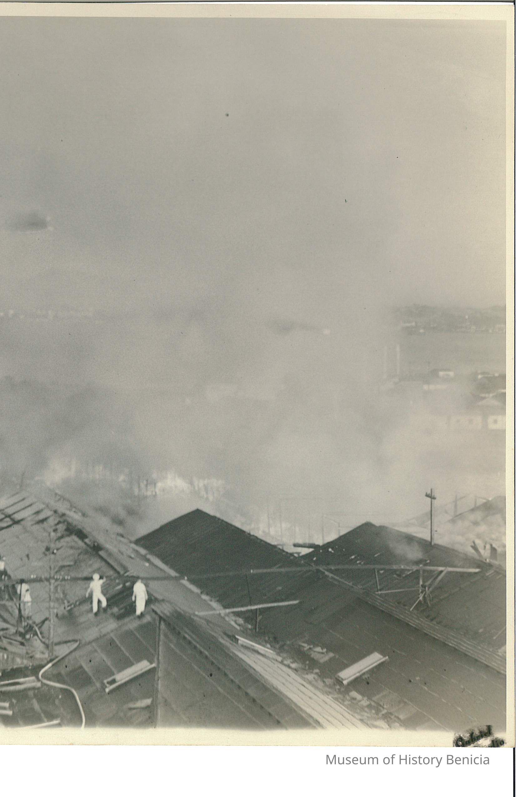 Black and White Photograph of the Benicia Tannery Fire - Blue ink lable on reverse - Mrs. Walter Mollenkopf 224 Hillcrest