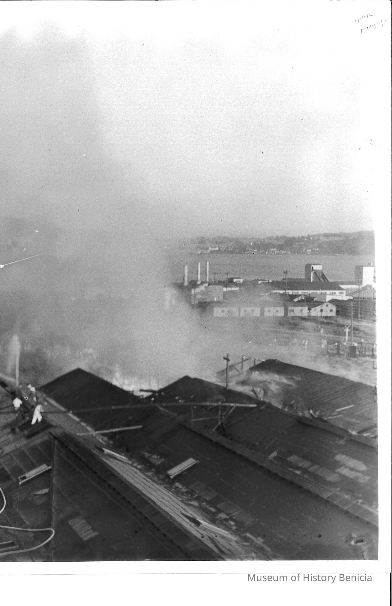 Black and White Photograph of the Bneicia Tannery Fire. With red pen on the reverse Sunday 7 Octo 1945