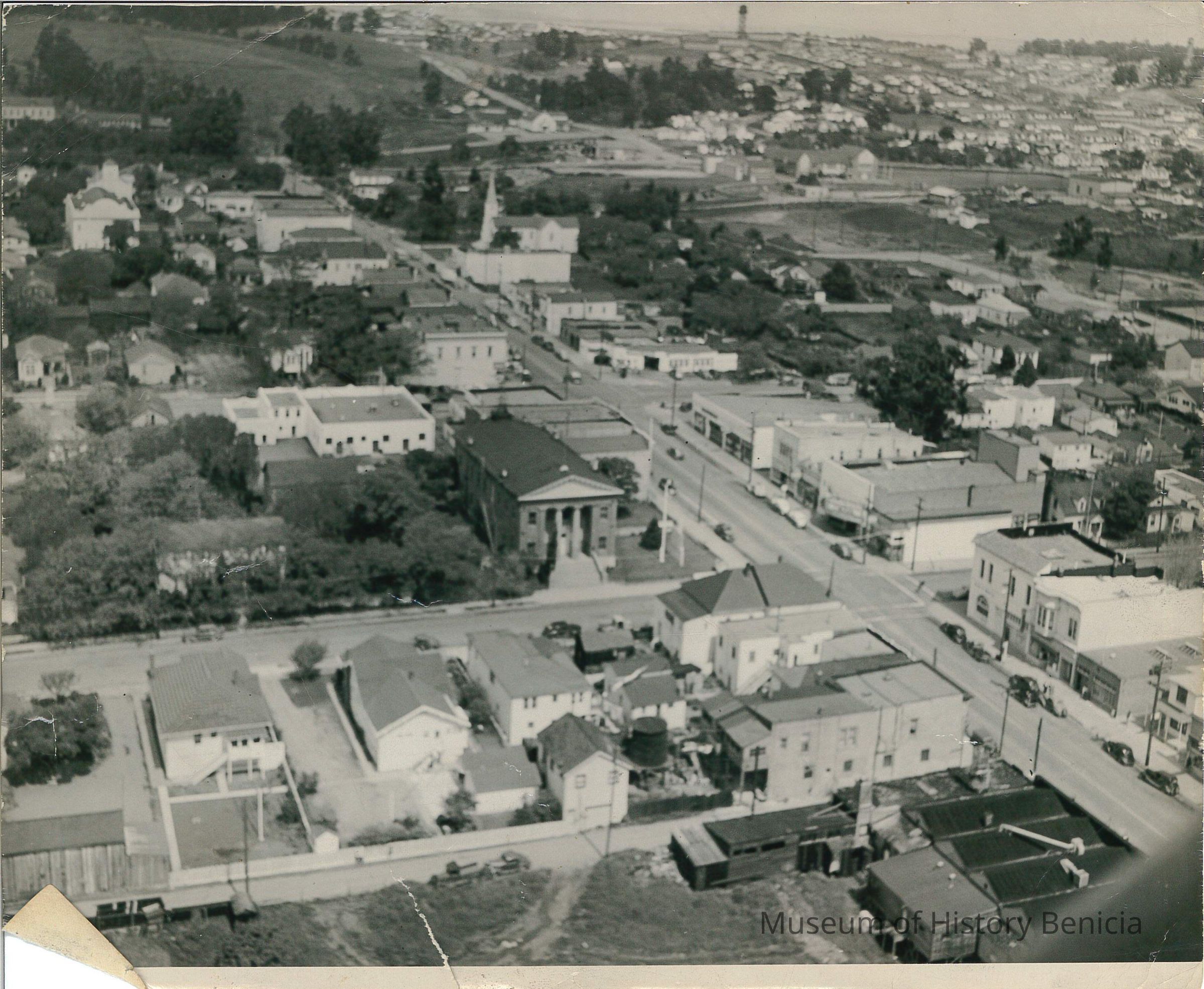 Black and White aerial view of downtown Benicia looking toward the Capital building