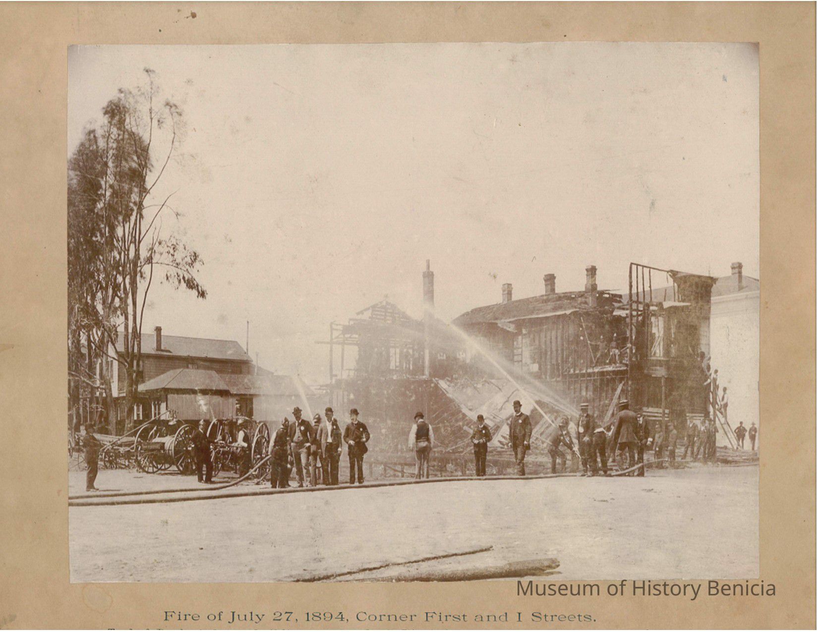 Albumen Photograph of the Fire of July 27, 1894 Corner First and I Steets. Teale & Parker's 2 story building consumed C.King's 2 story building partially consumed - Image marked Benicia Public Library on Reverse and Presented o Benicia Library by Milo Passalaqua, Date 2/26/54;