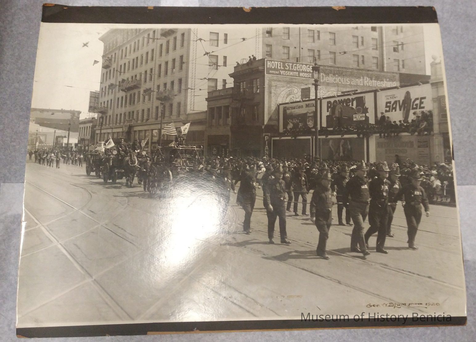 B/W Photograph of the Benicia Fire department in a parade in San Francisco pulling the phoenix. It might be the steam pumper from the Aresenal right behind them.Collection